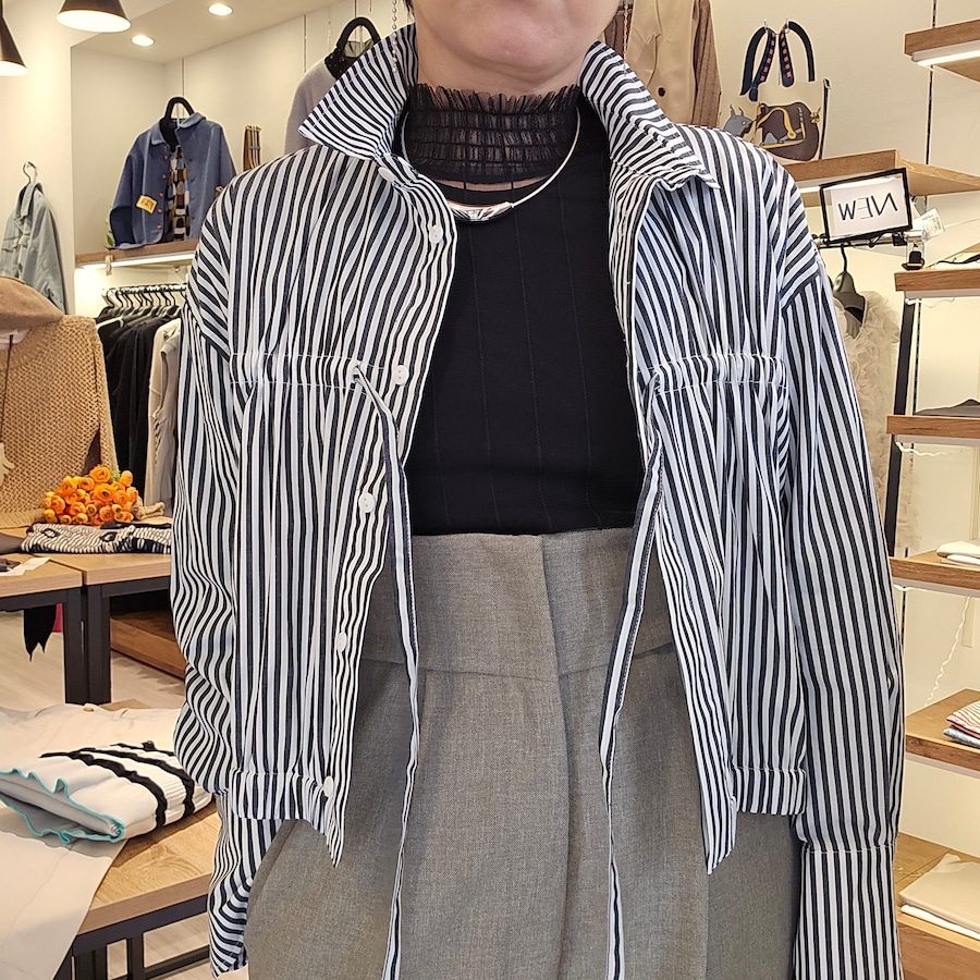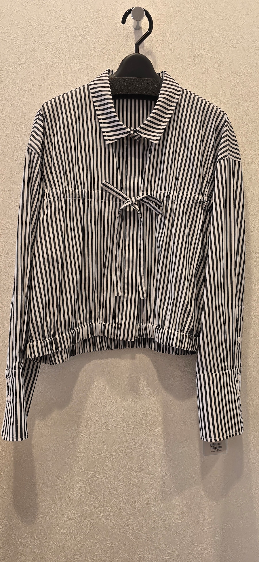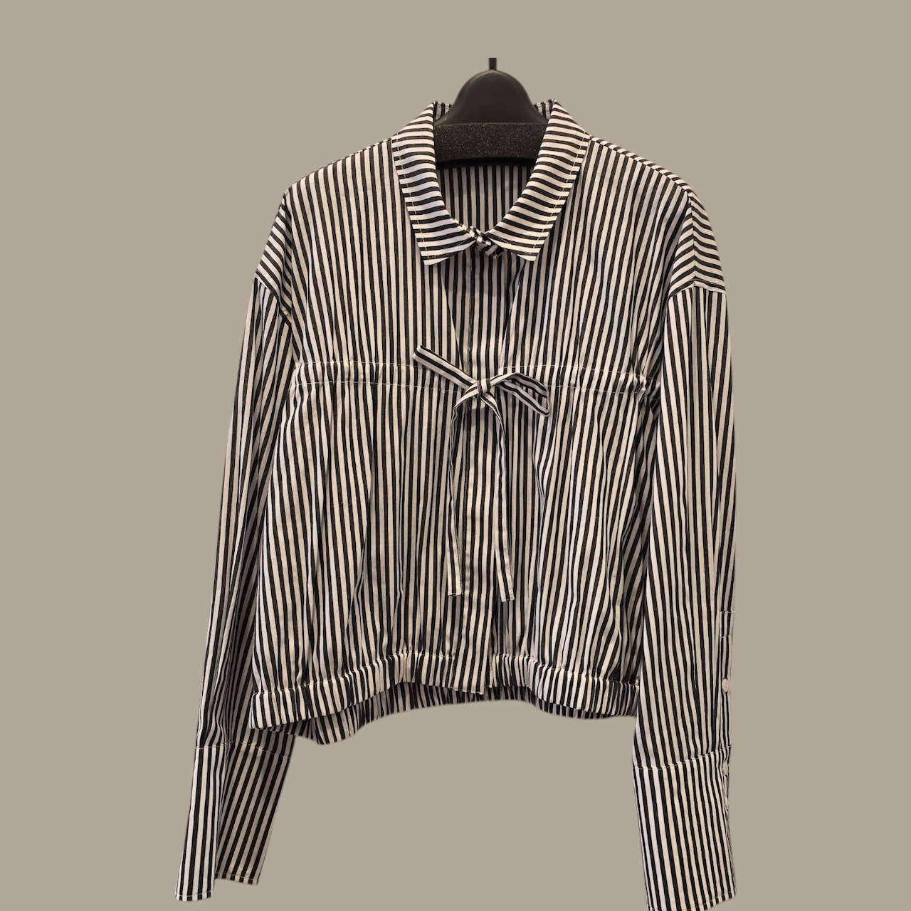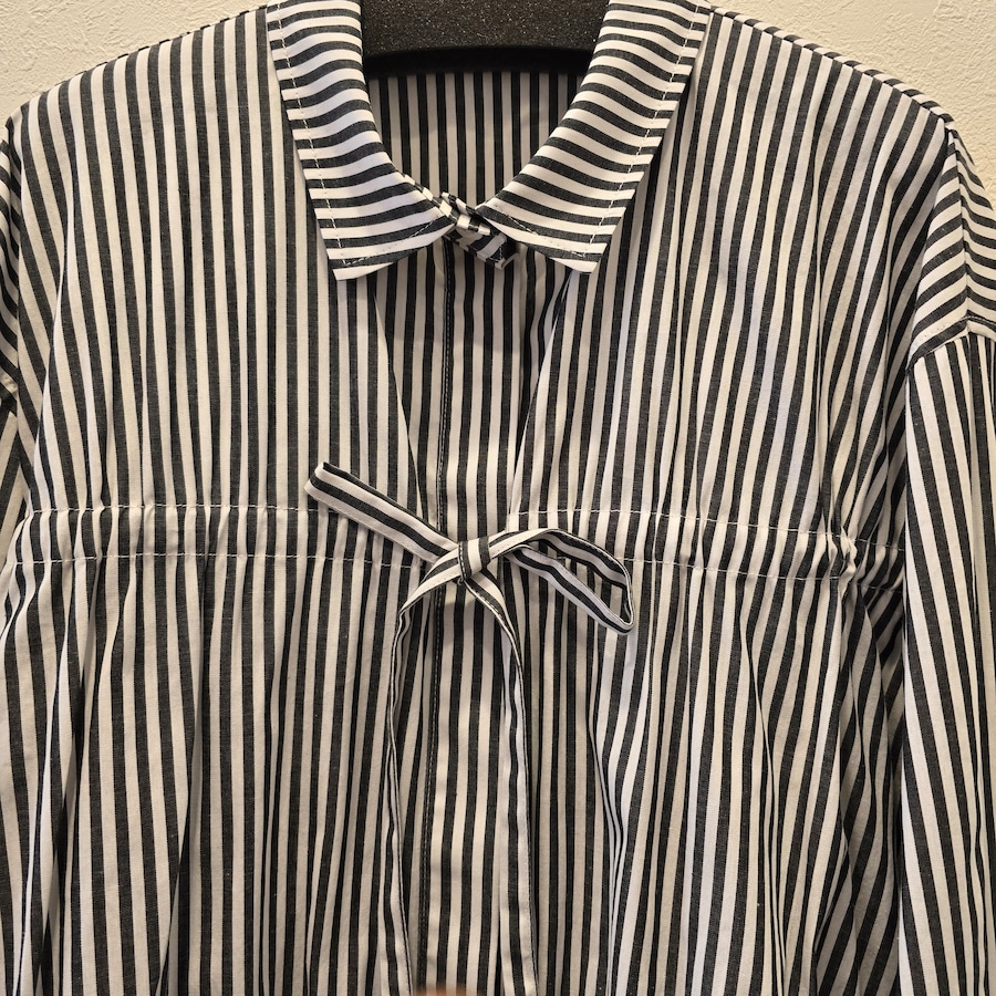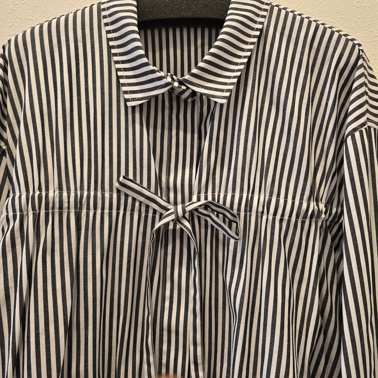 クールでスタイリッシュな印象を与える【ストライプシャツ】。黒ストライプが特徴的で、どんなシーンにもマッチする洗練されたデザインです。胸元のリボンで絞れる仕様は、あなたの体型に合わせたフィット感を提供し、裾はゴム仕様で動きやすさも抜群!カジュアルながらもきちんと感を演出する、一着で色々なスタイルを楽しめます。