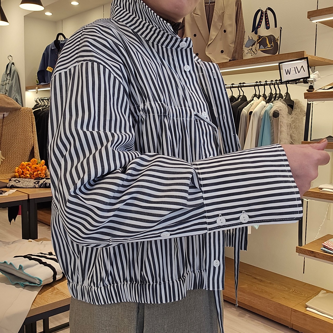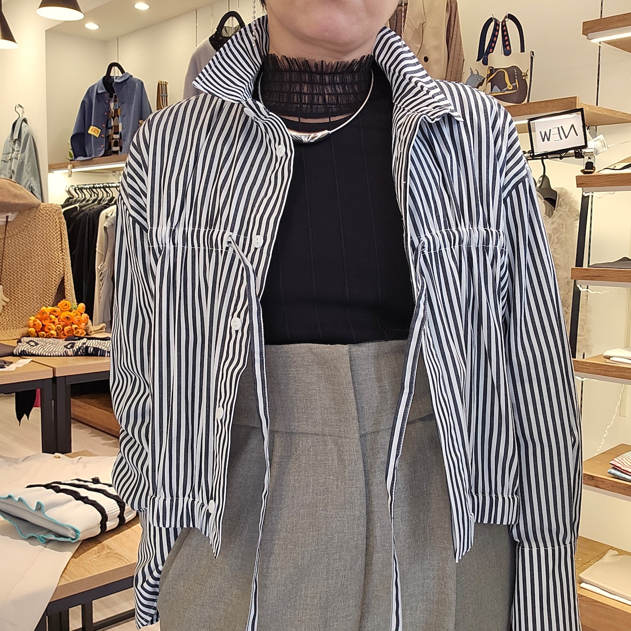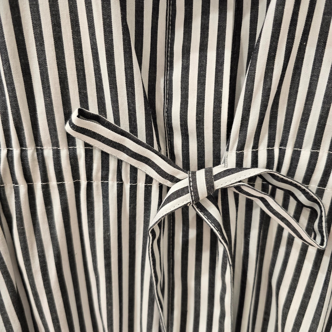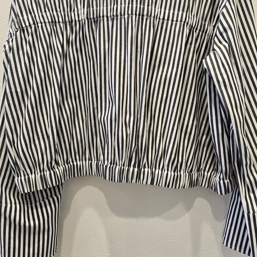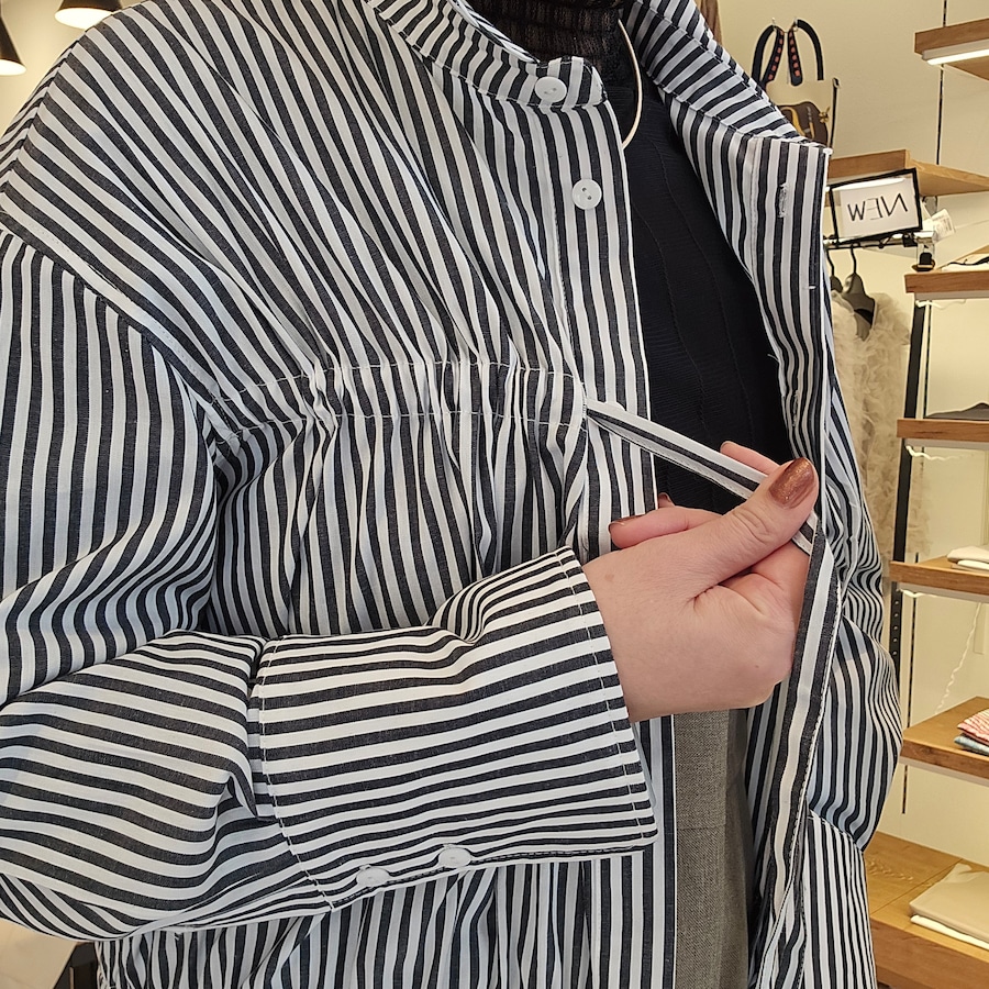 クールでスタイリッシュな印象を与える【ストライプシャツ】。黒ストライプが特徴的で、どんなシーンにもマッチする洗練されたデザインです。胸元のリボンで絞れる仕様は、あなたの体型に合わせたフィット感を提供し、裾はゴム仕様で動きやすさも抜群!カジュアルながらもきちんと感を演出する、一着で色々なスタイルを楽しめます。