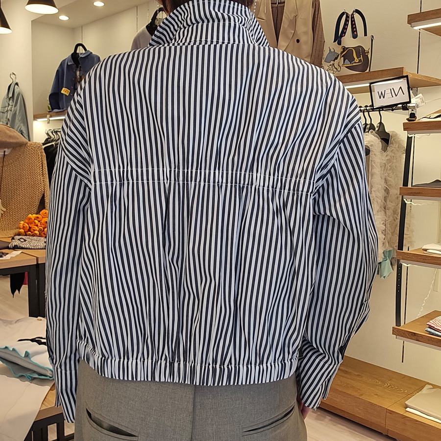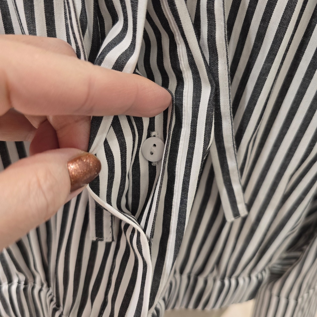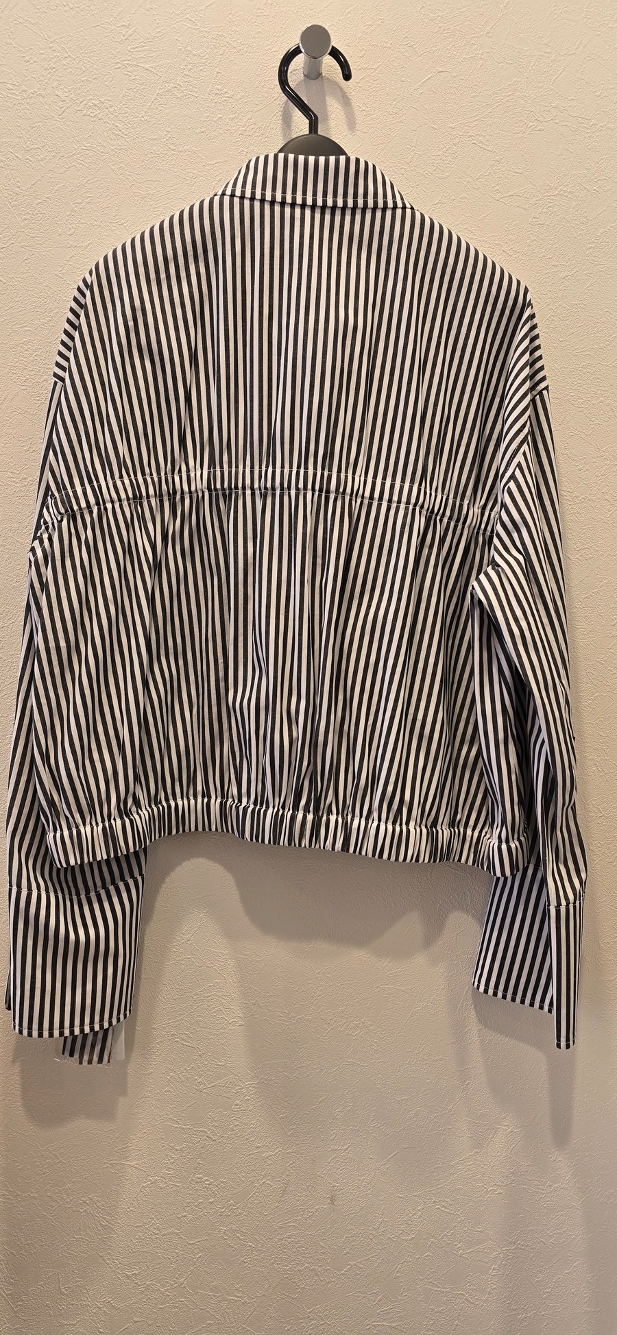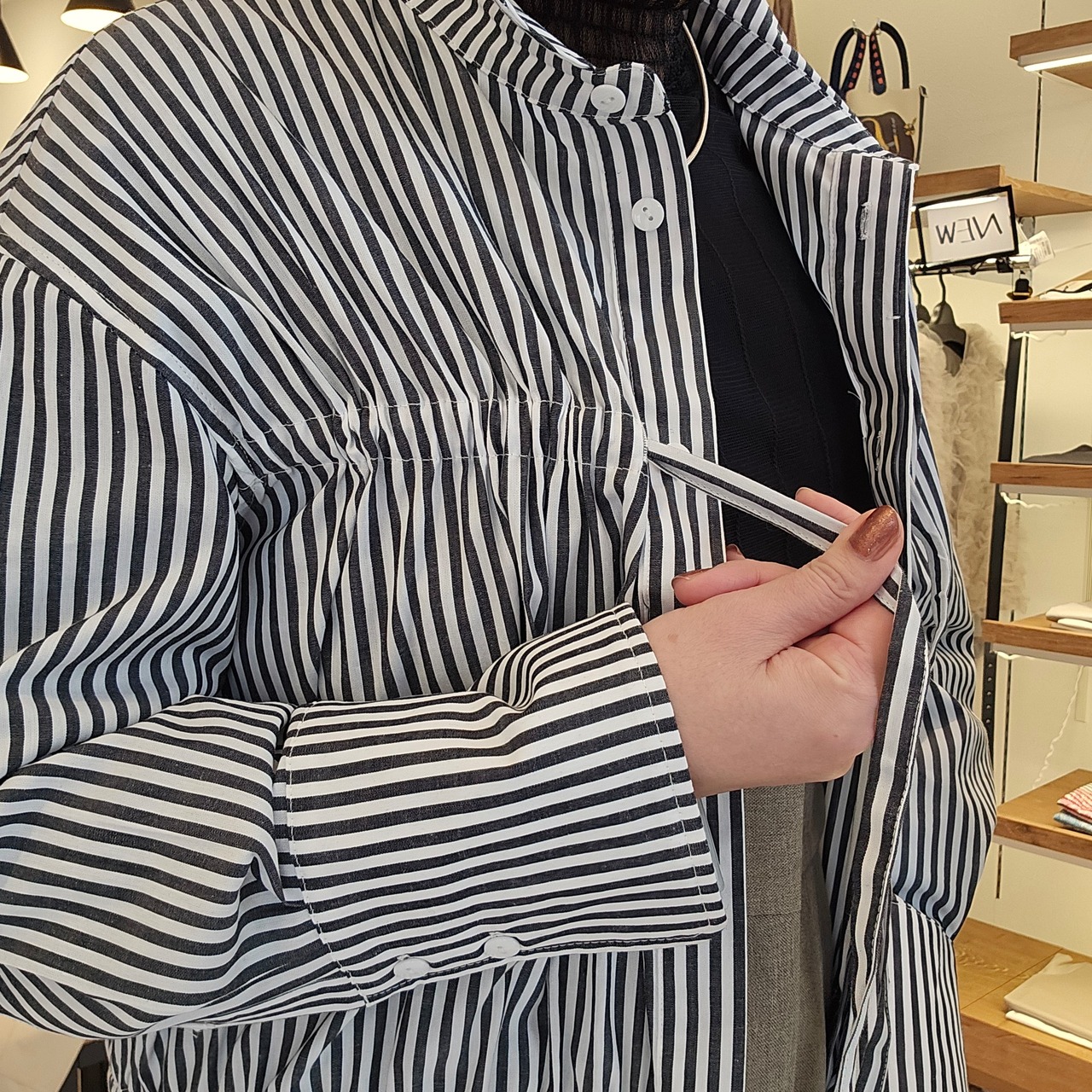 クールでスタイリッシュな印象を与える【ストライプシャツ】。黒ストライプが特徴的で、どんなシーンにもマッチする洗練されたデザインです。胸元のリボンで絞れる仕様は、あなたの体型に合わせたフィット感を提供し、裾はゴム仕様で動きやすさも抜群!カジュアルながらもきちんと感を演出する、一着で色々なスタイルを楽しめます。