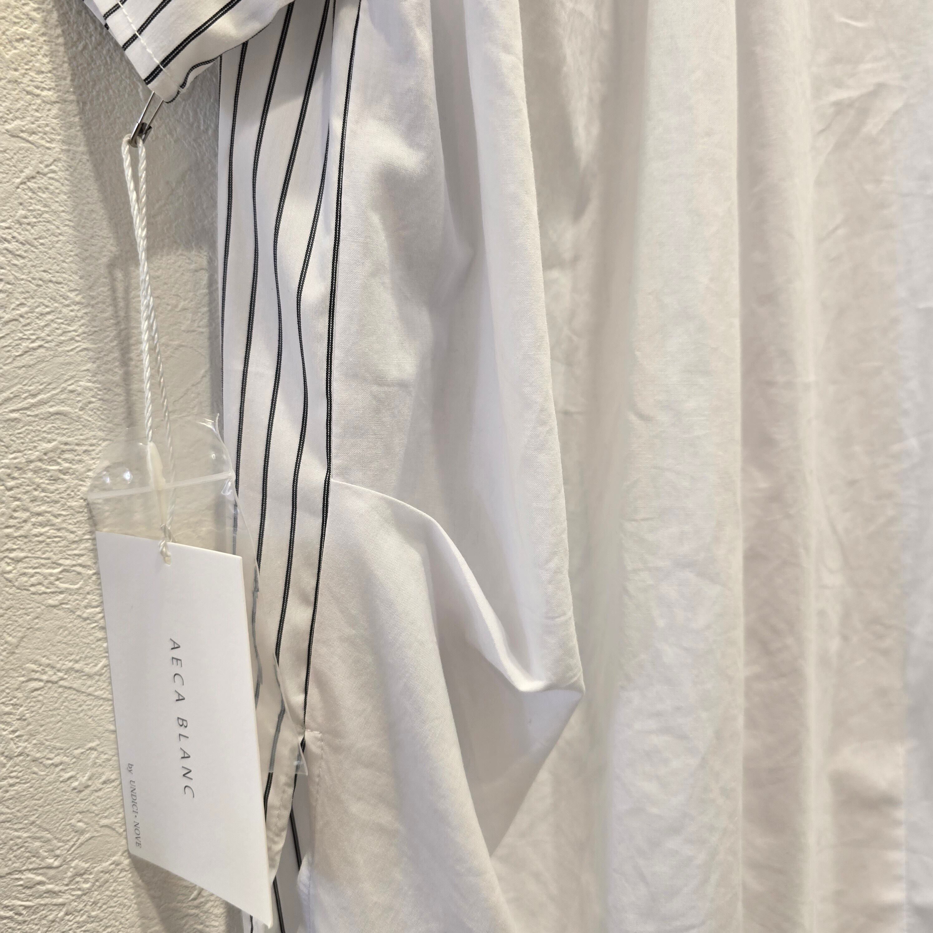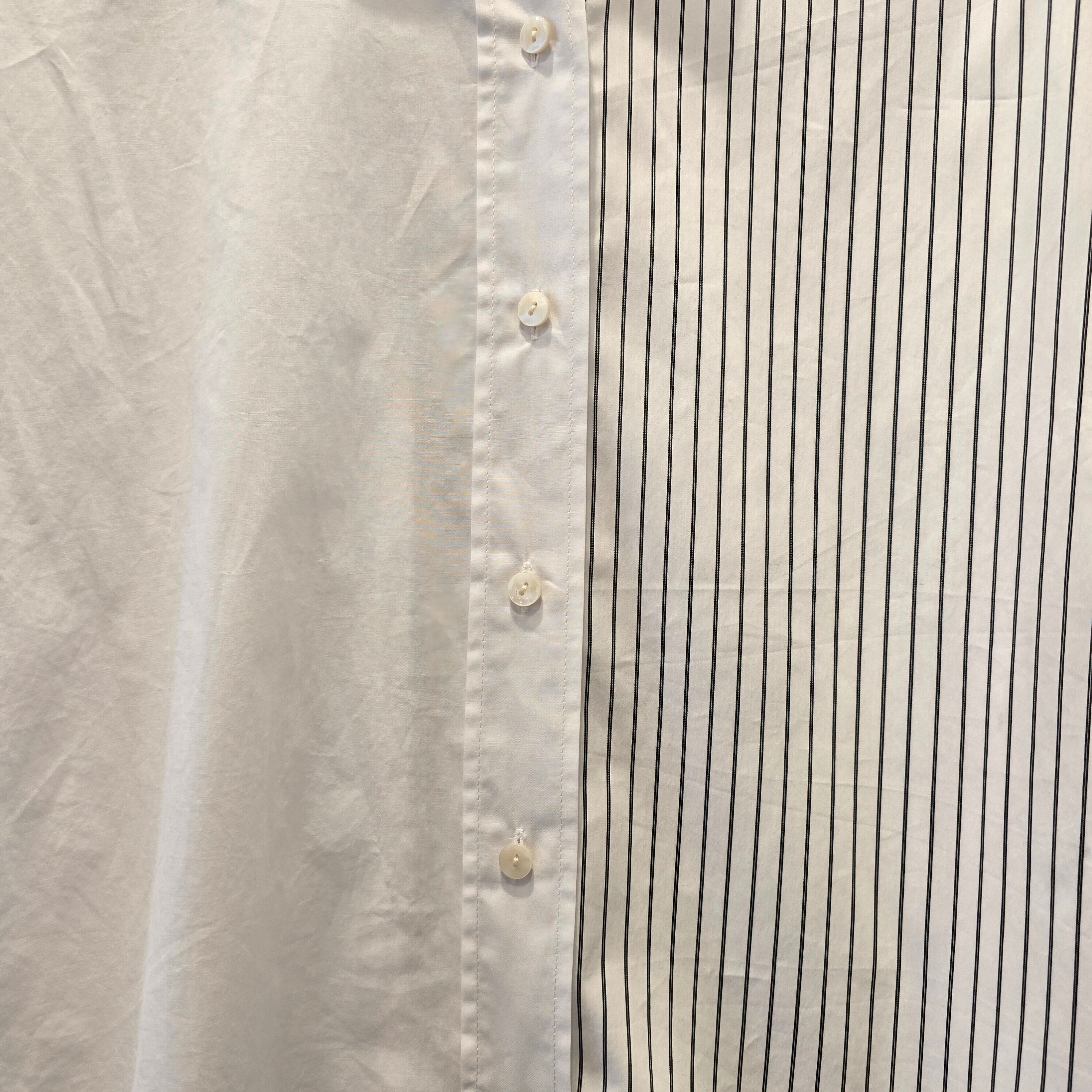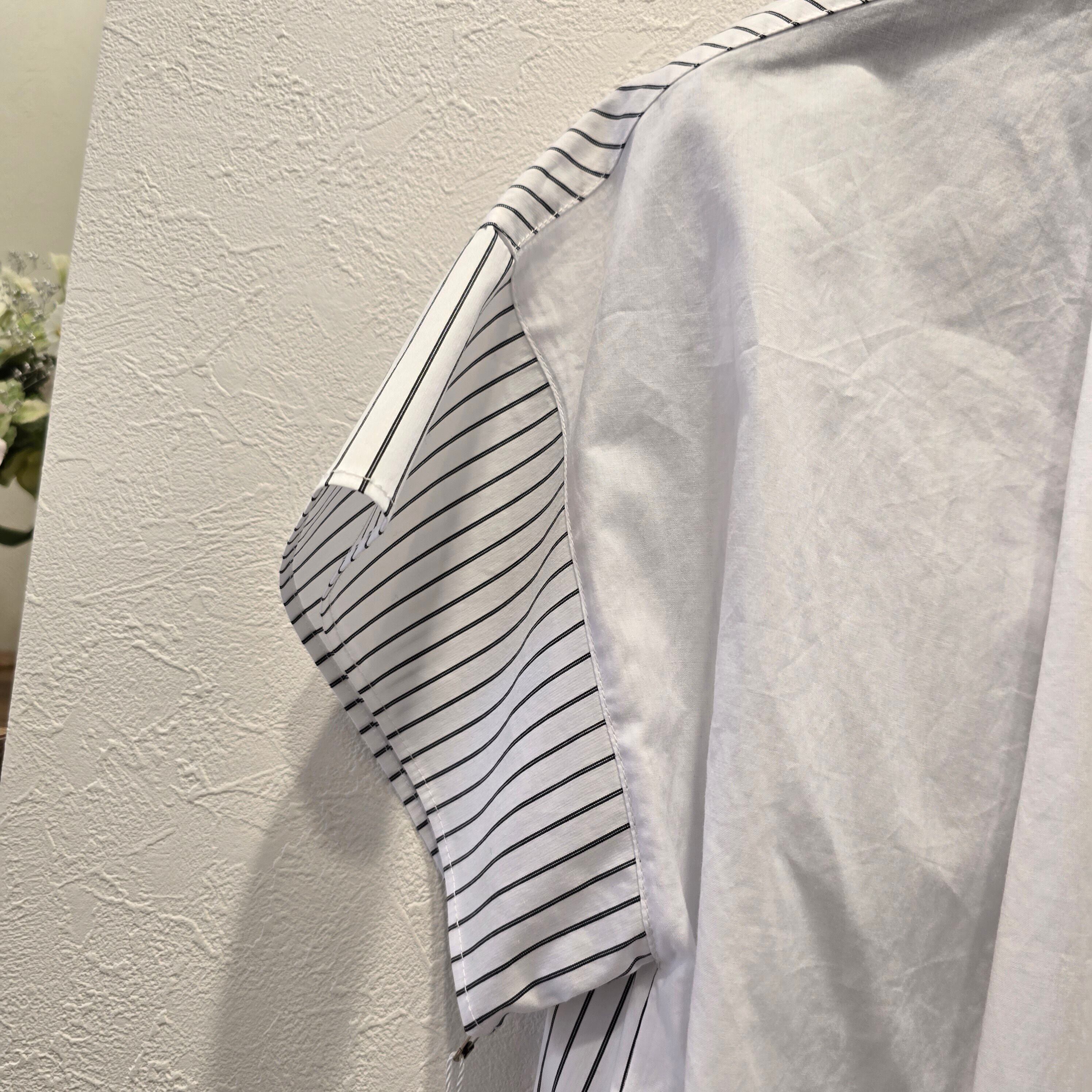 無地とストライプがミックスされたストライプシャツは、後ろタック入りでゆったりとしたシルエットが特徴です。柔らかな生地は肌触りが良く、快適な着心地を実現。前裾丈はボタンホールで調整可能なので、その日のスタイルに合わせたアレンジが楽しめます!