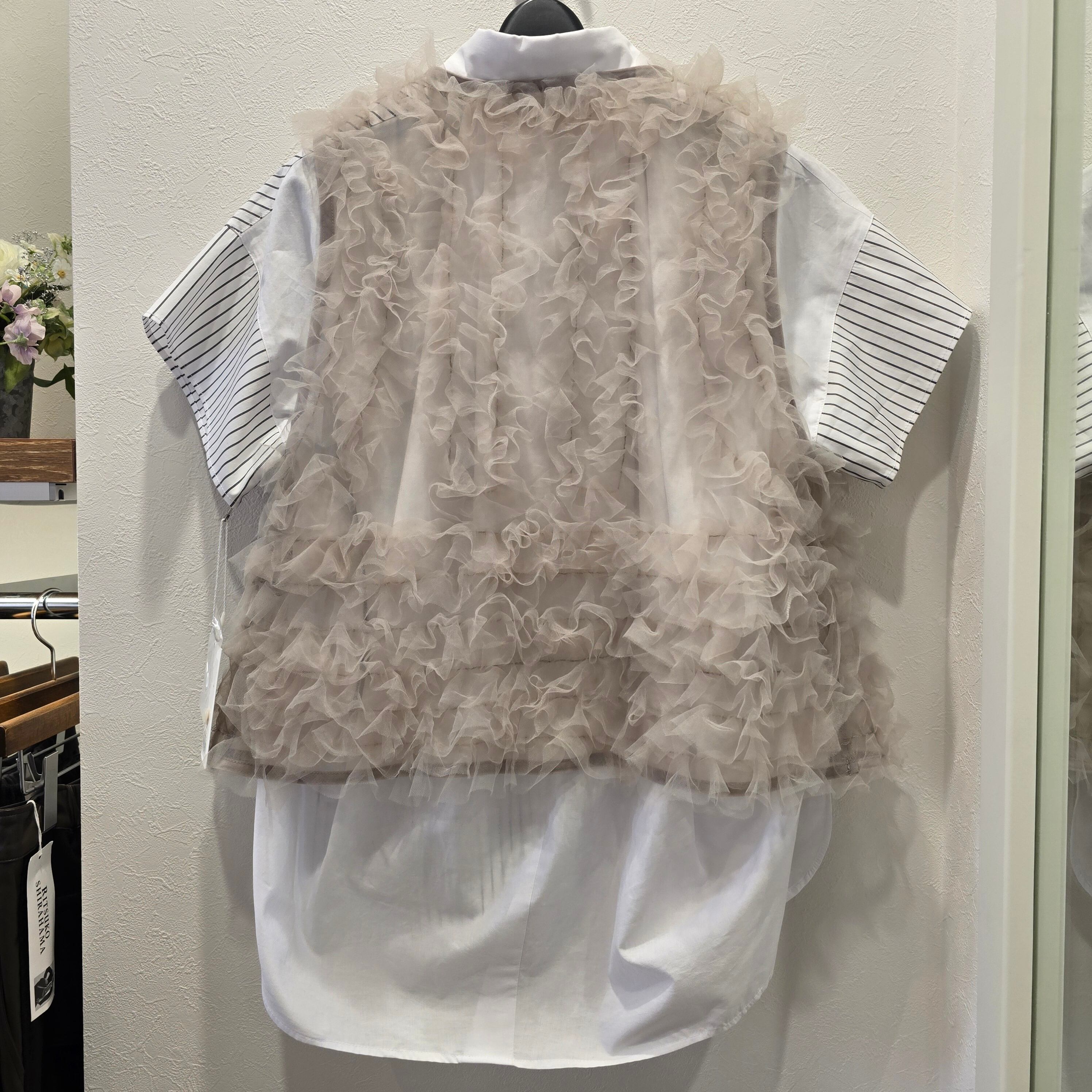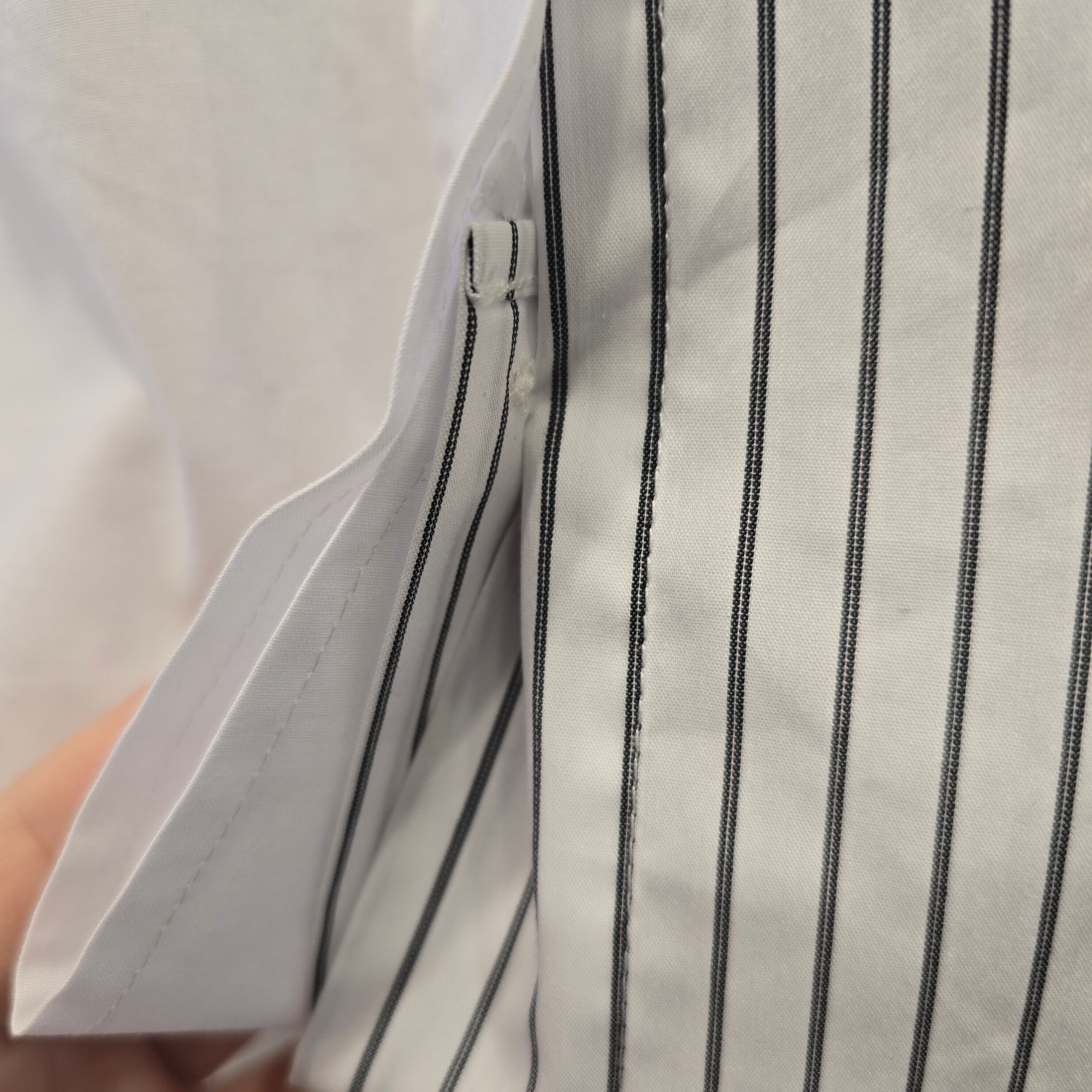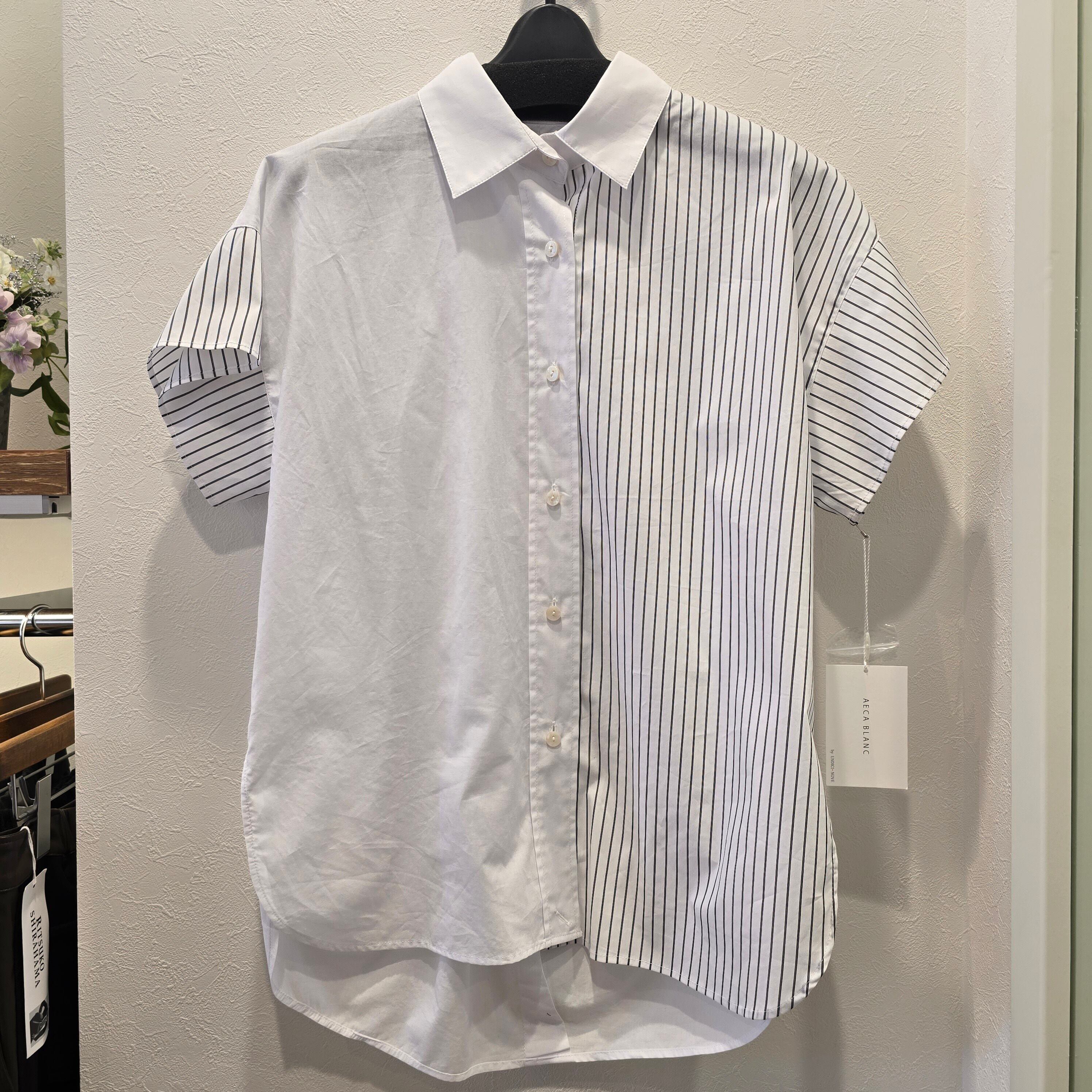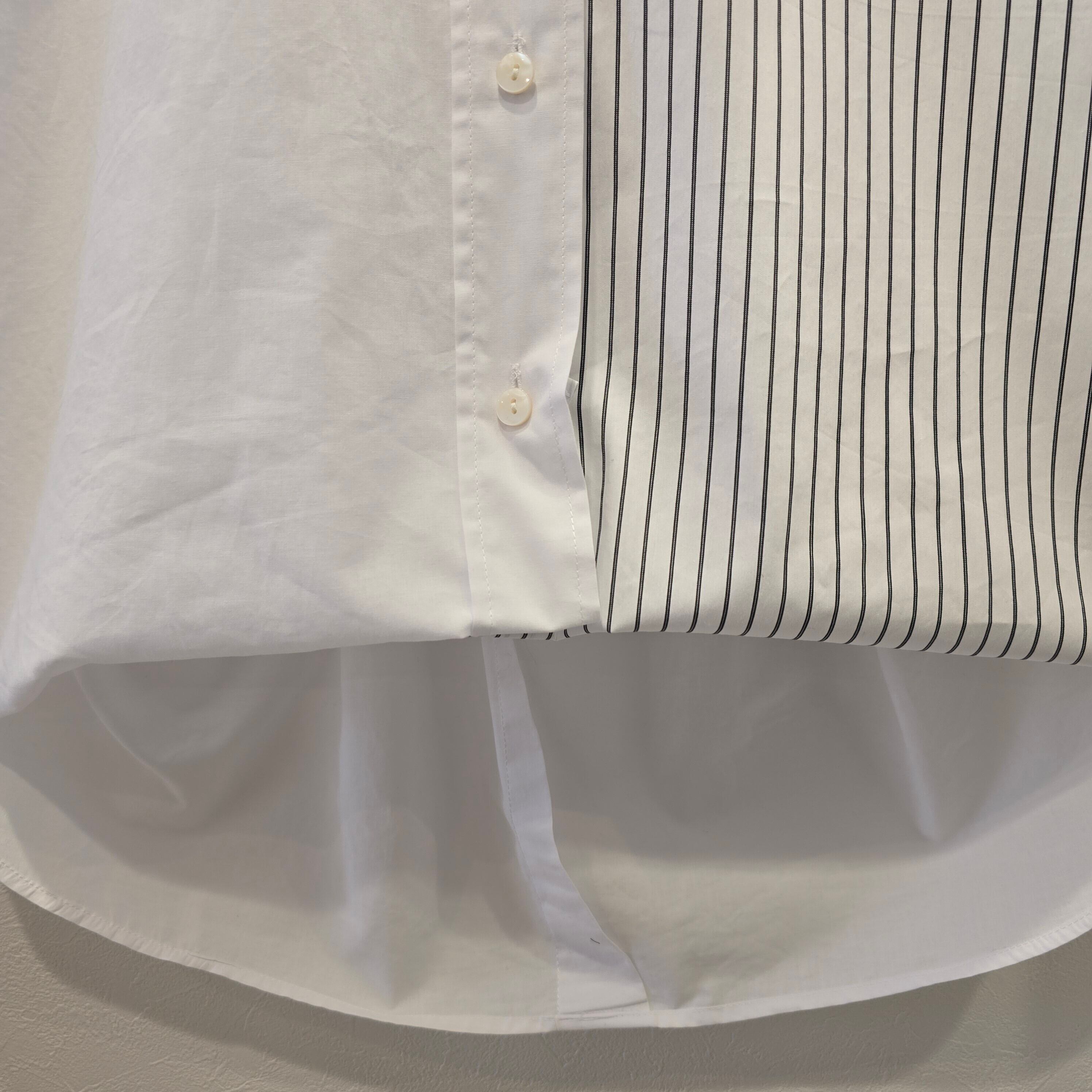 無地とストライプがミックスされたストライプシャツは、後ろタック入りでゆったりとしたシルエットが特徴です。柔らかな生地は肌触りが良く、快適な着心地を実現。前裾丈はボタンホールで調整可能なので、その日のスタイルに合わせたアレンジが楽しめます!