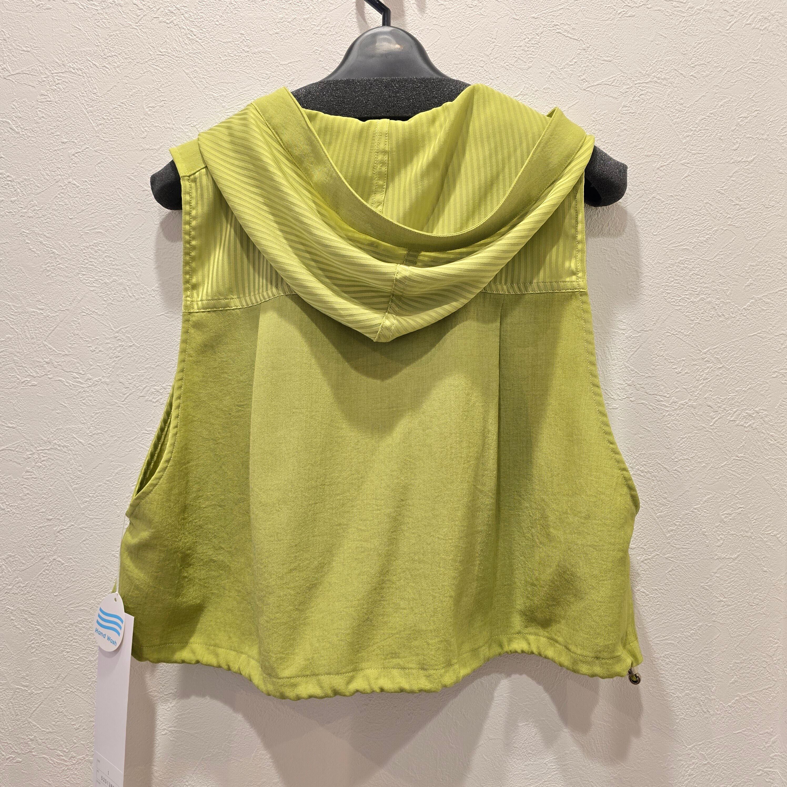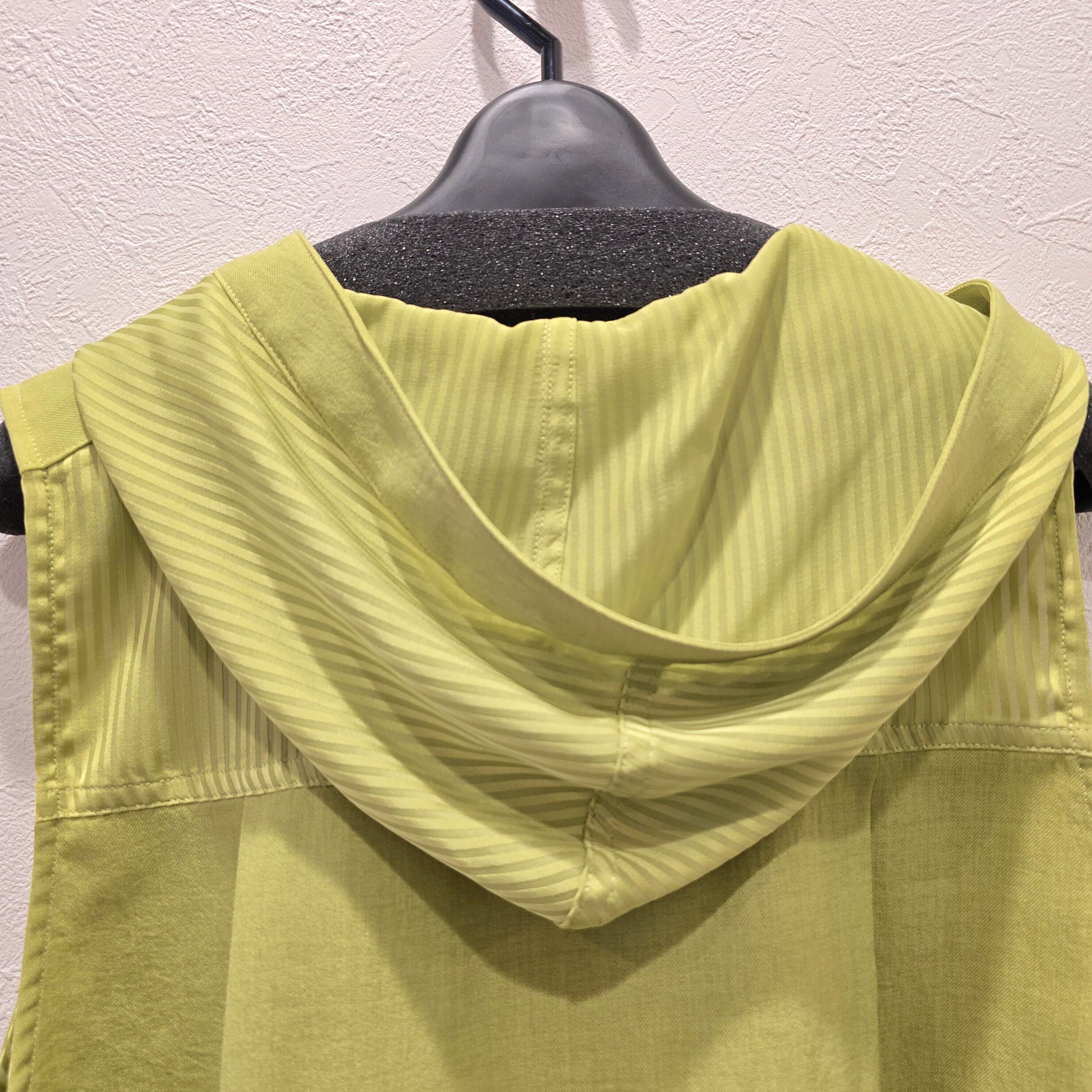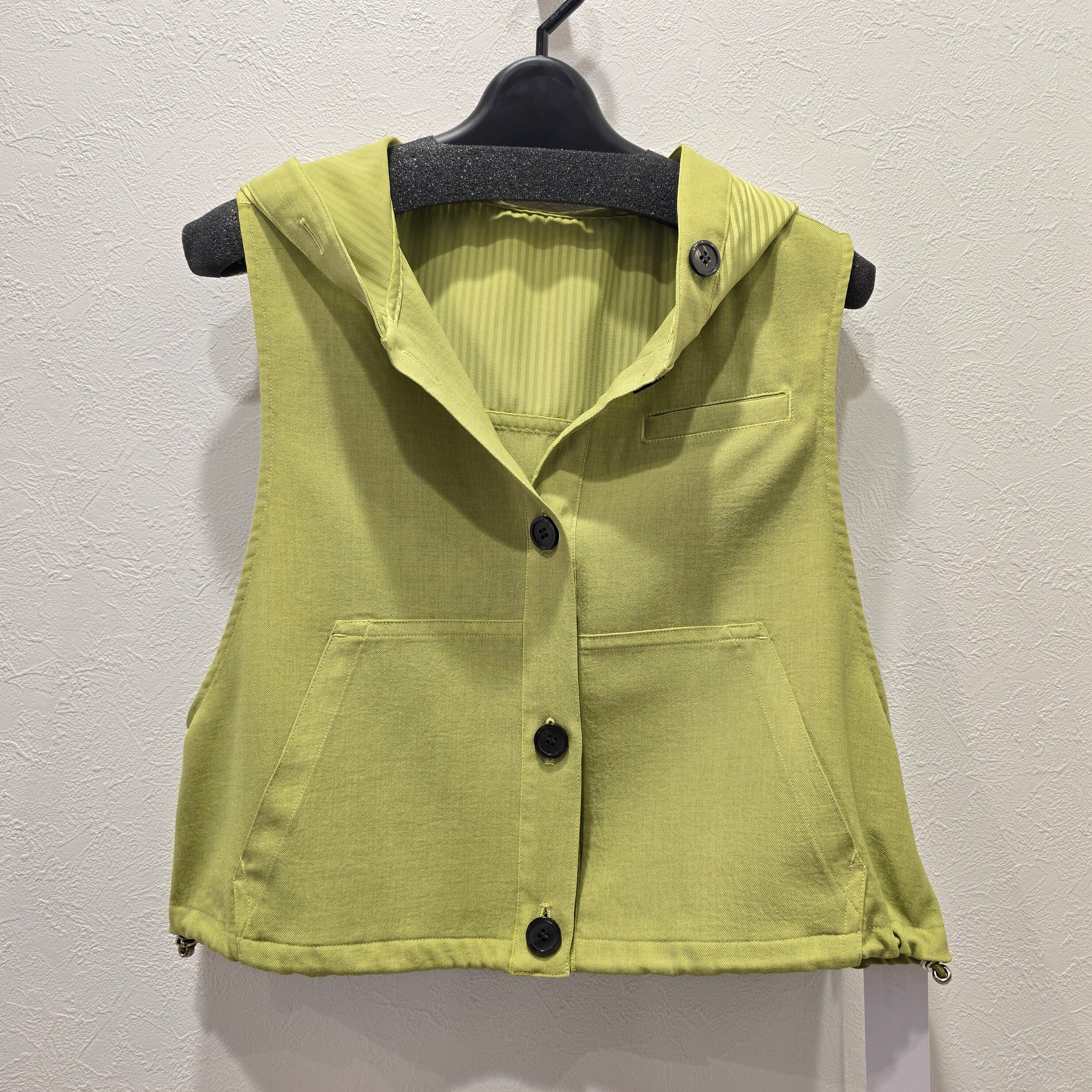 このベスト【シラハマリツコ】は、ストライプデザインのフードが特徴的で、ライトグリーンのカラーがコーディネートのポイントになります!単丈のデザインはスタイルアップ効果もあり、どんなシーンでも活躍する一着です。