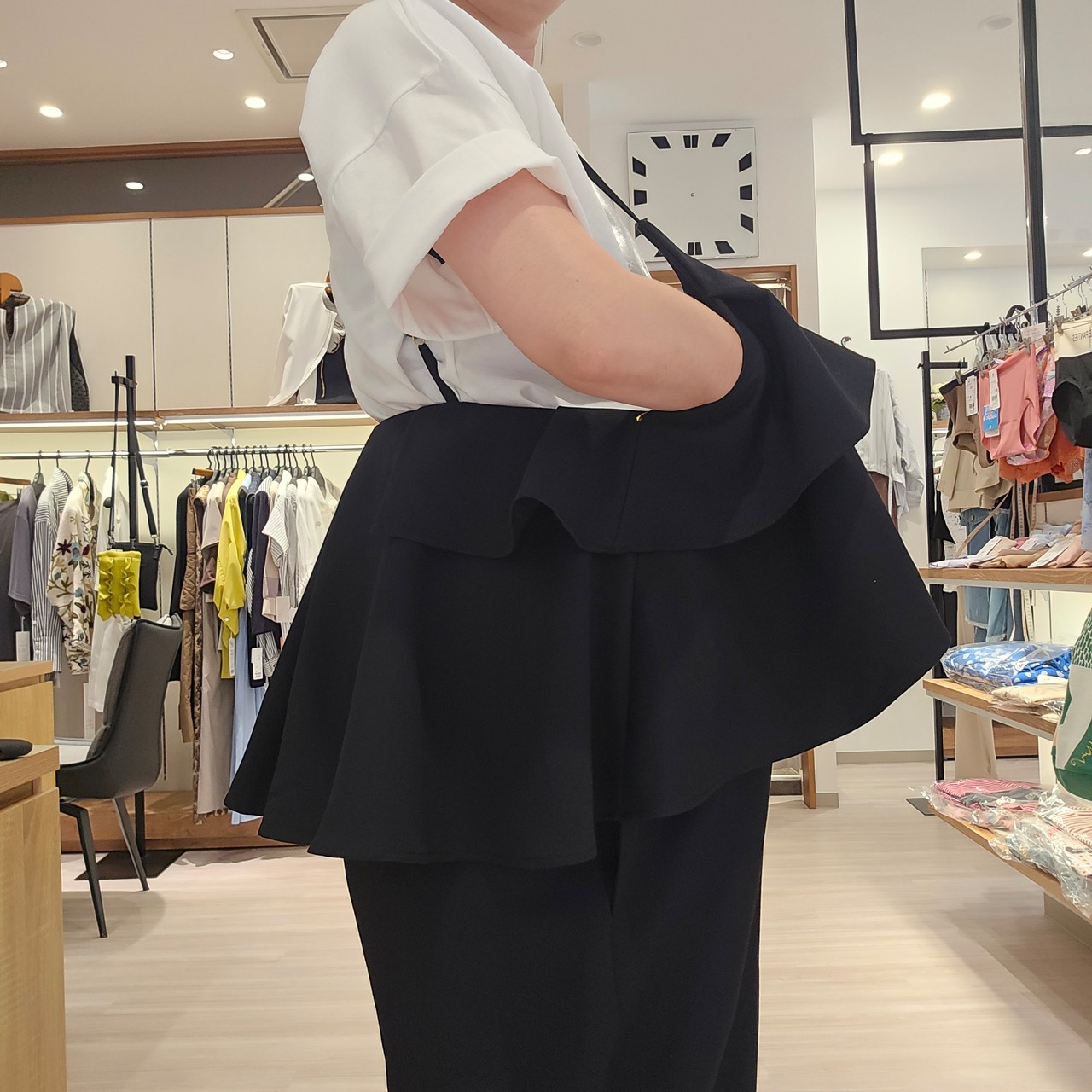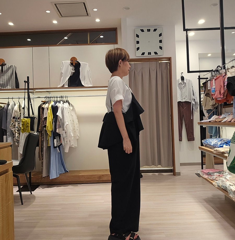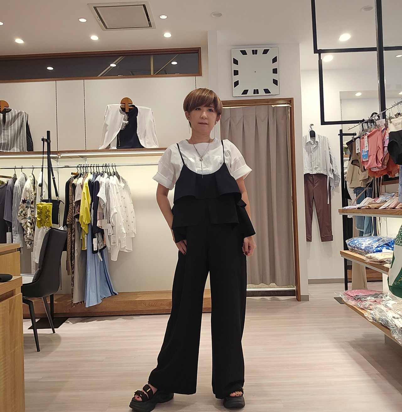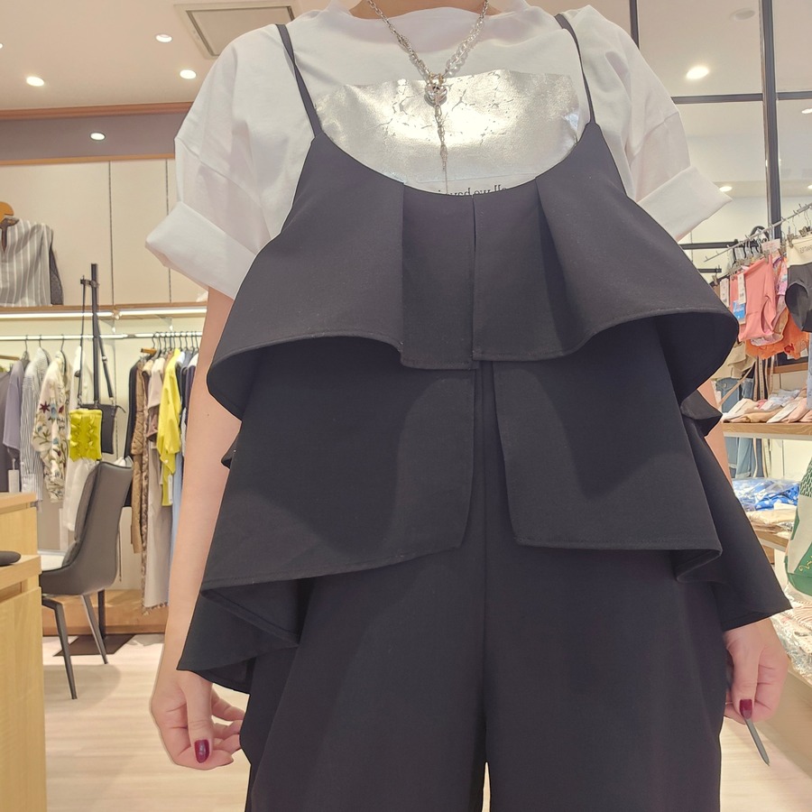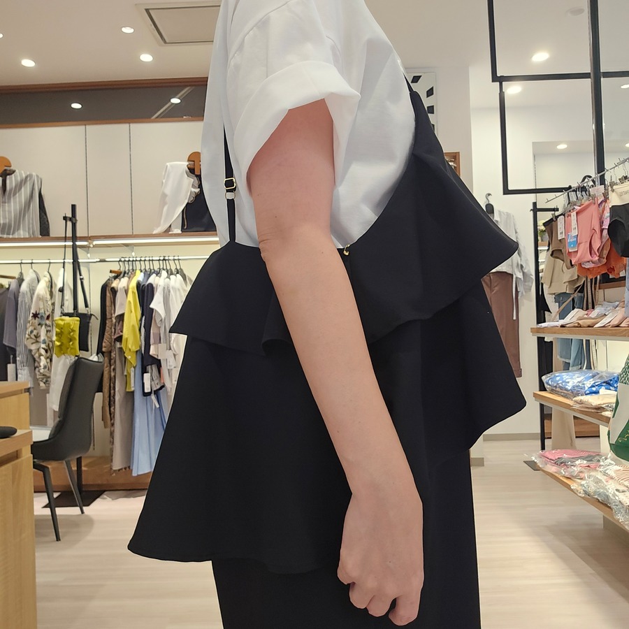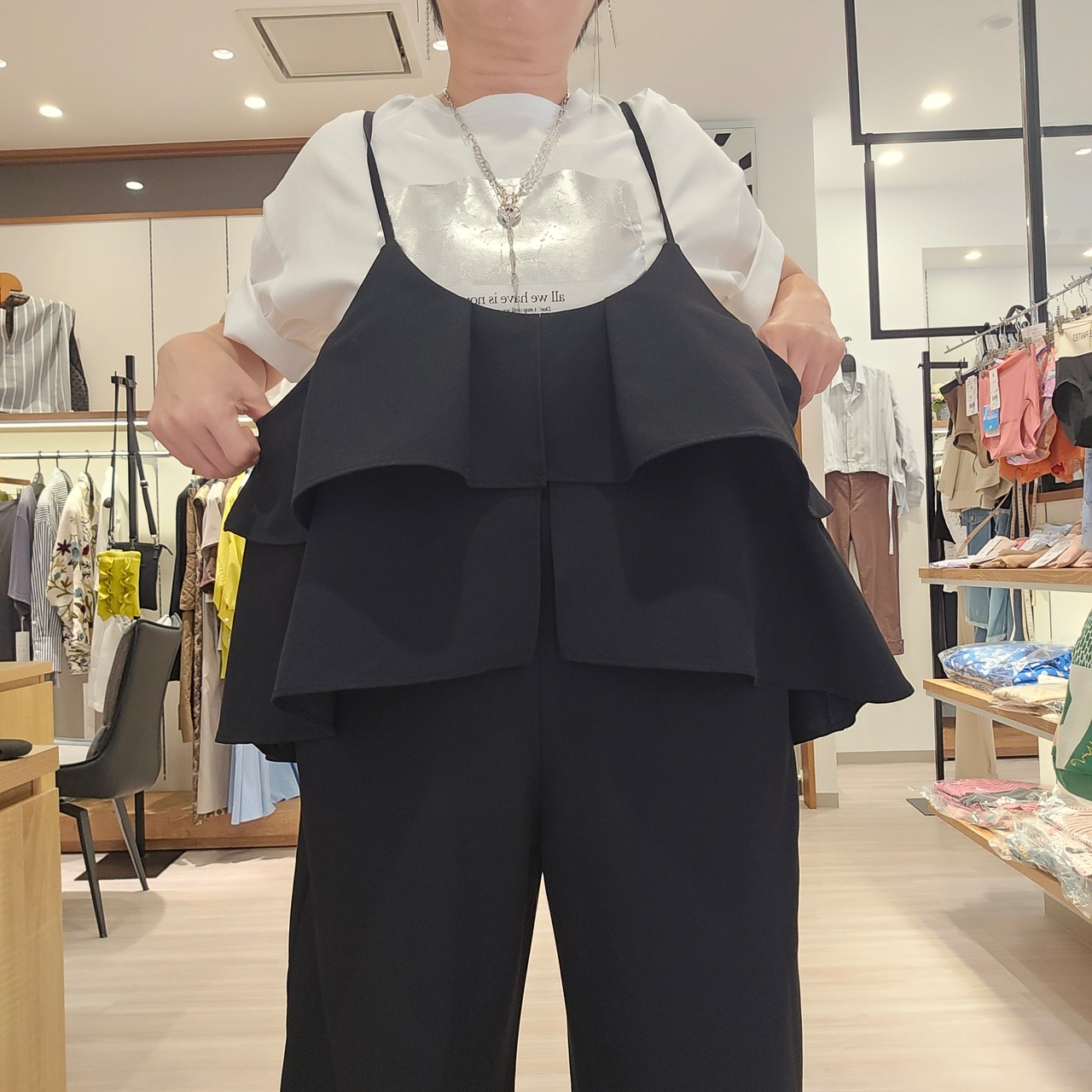 この「フリルサロペット」は、大きめフリルが特徴で、さらっとした落ち感のある素材なので太って見えないです。長さ調節が可能。