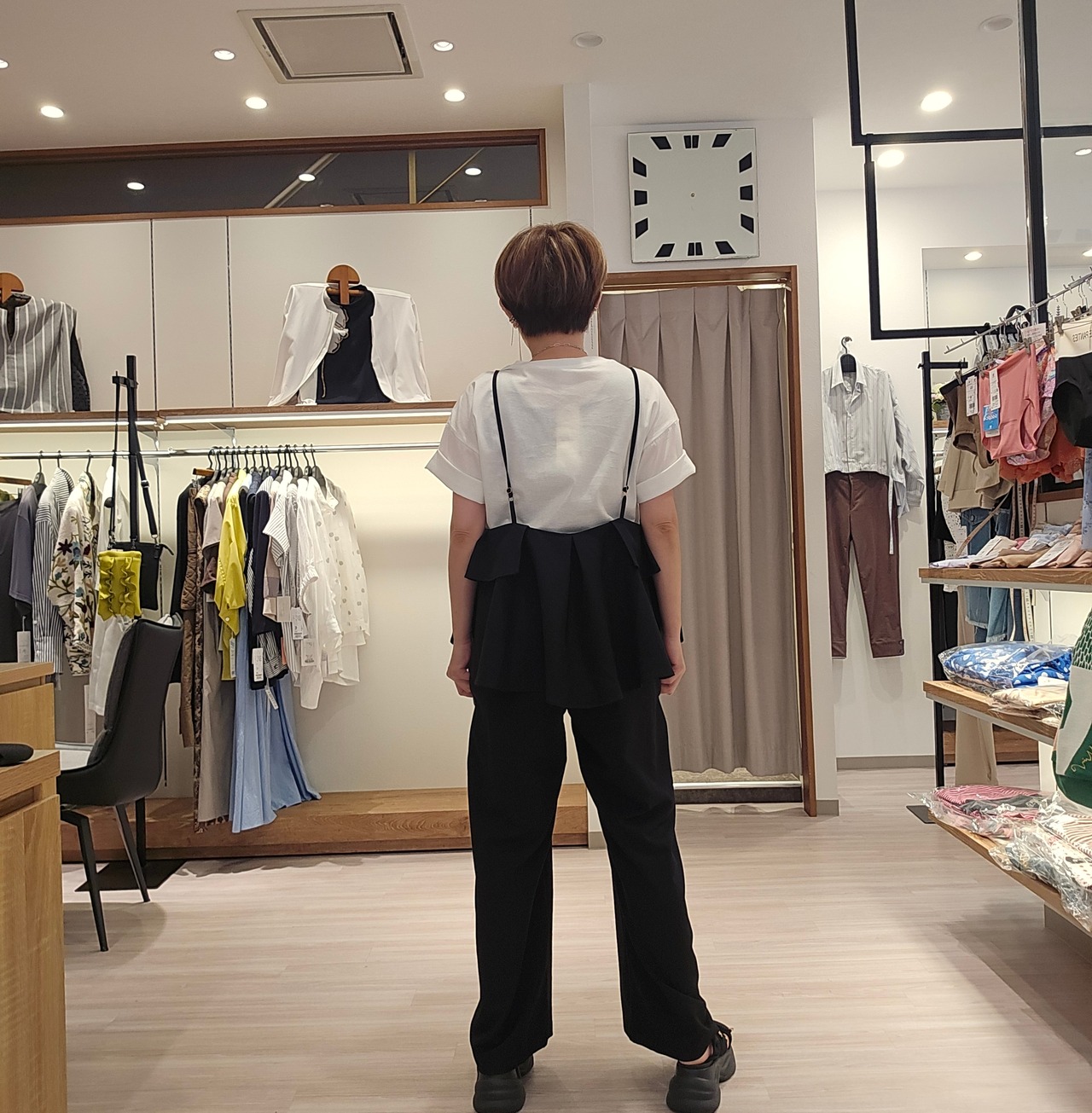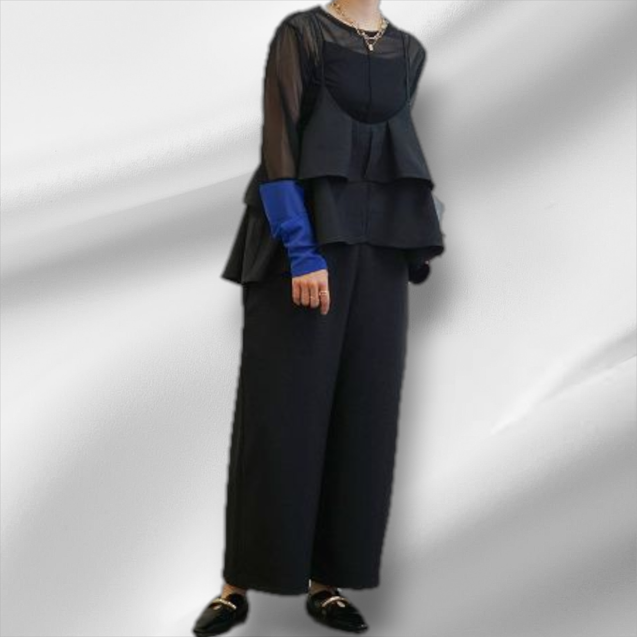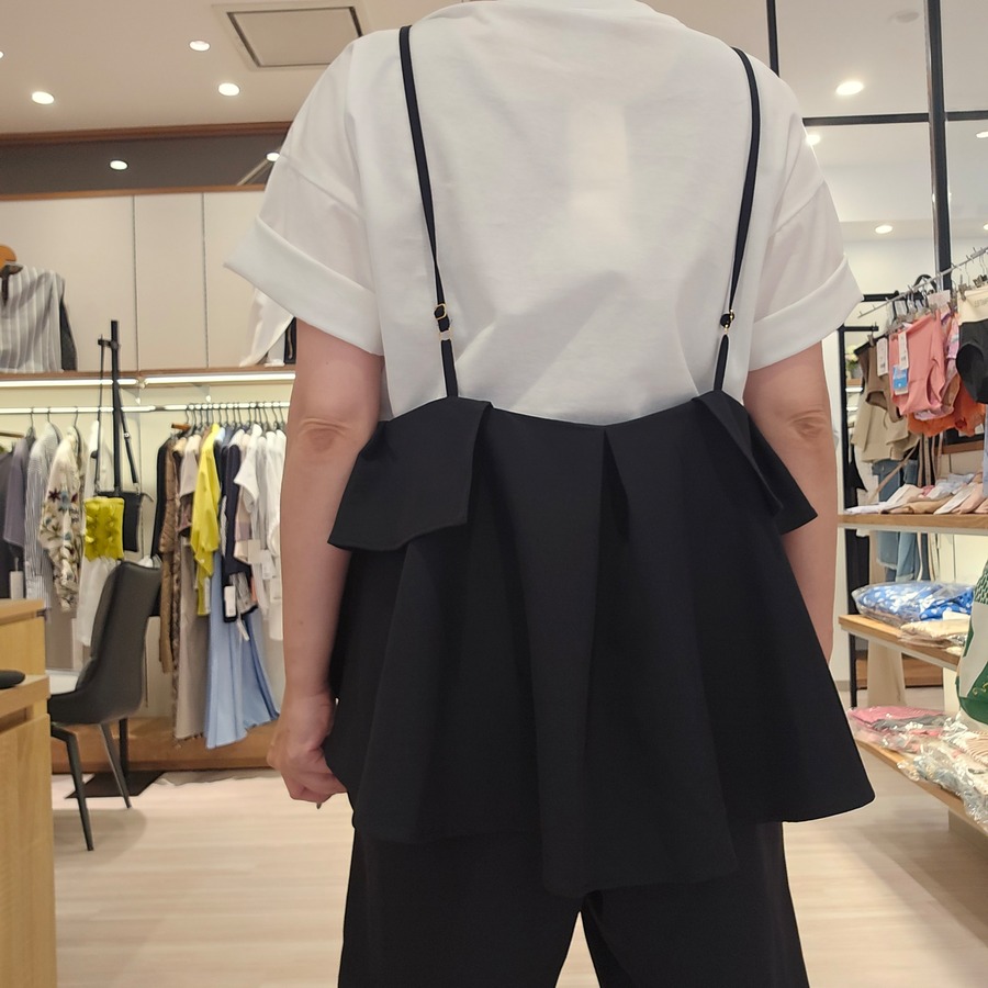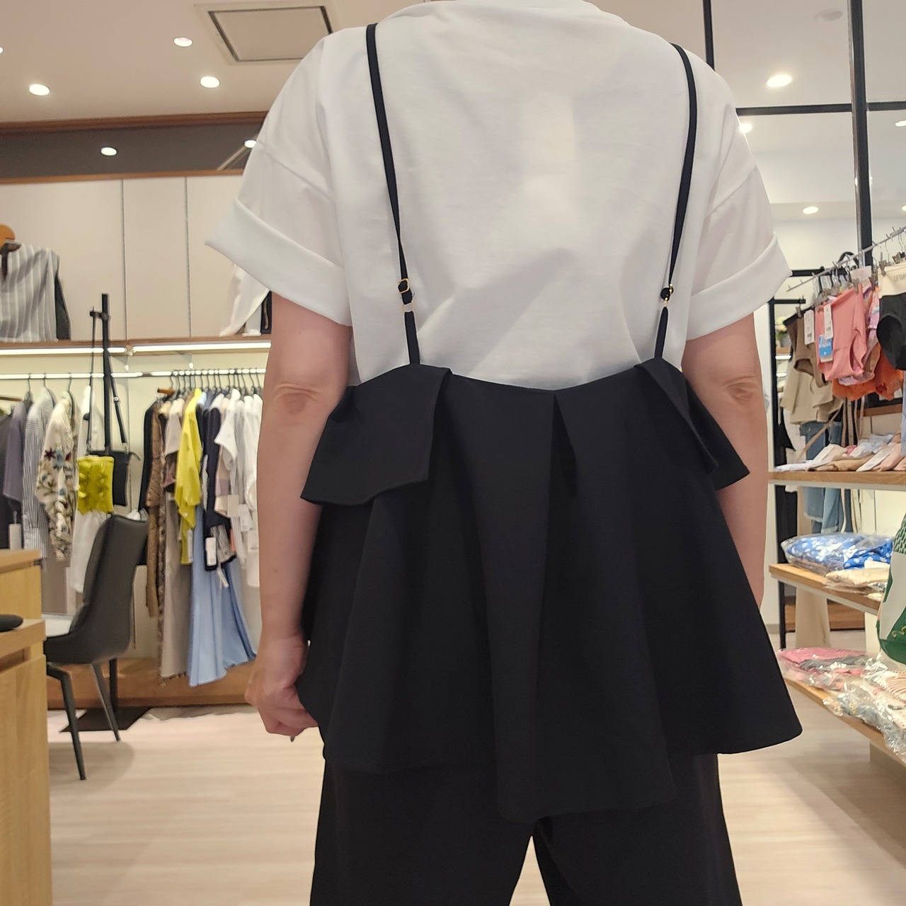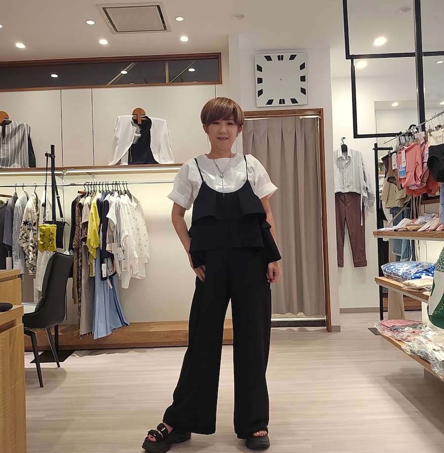 この「フリルサロペット」は、大きめフリルが特徴で、さらっとした落ち感のある素材なので太って見えないです。長さ調節が可能。