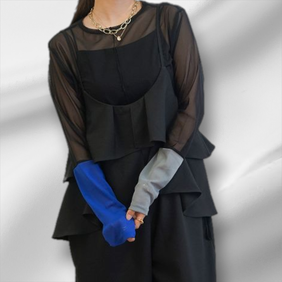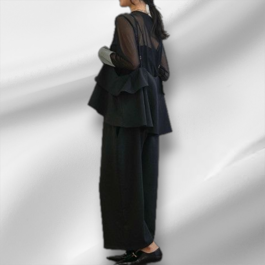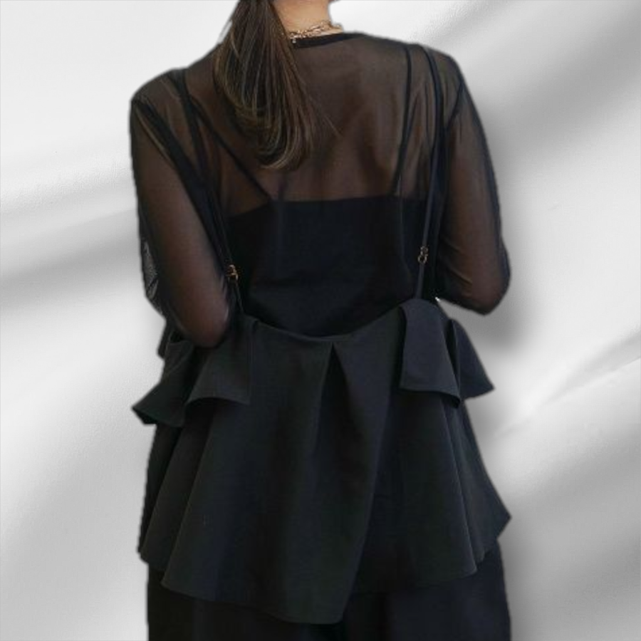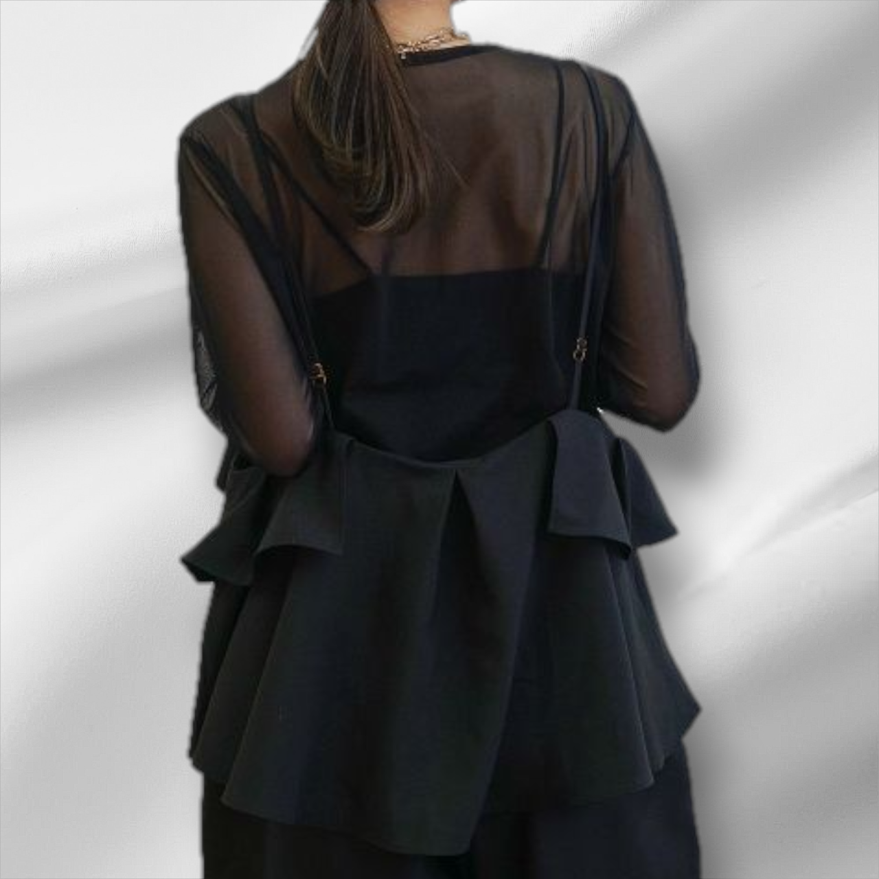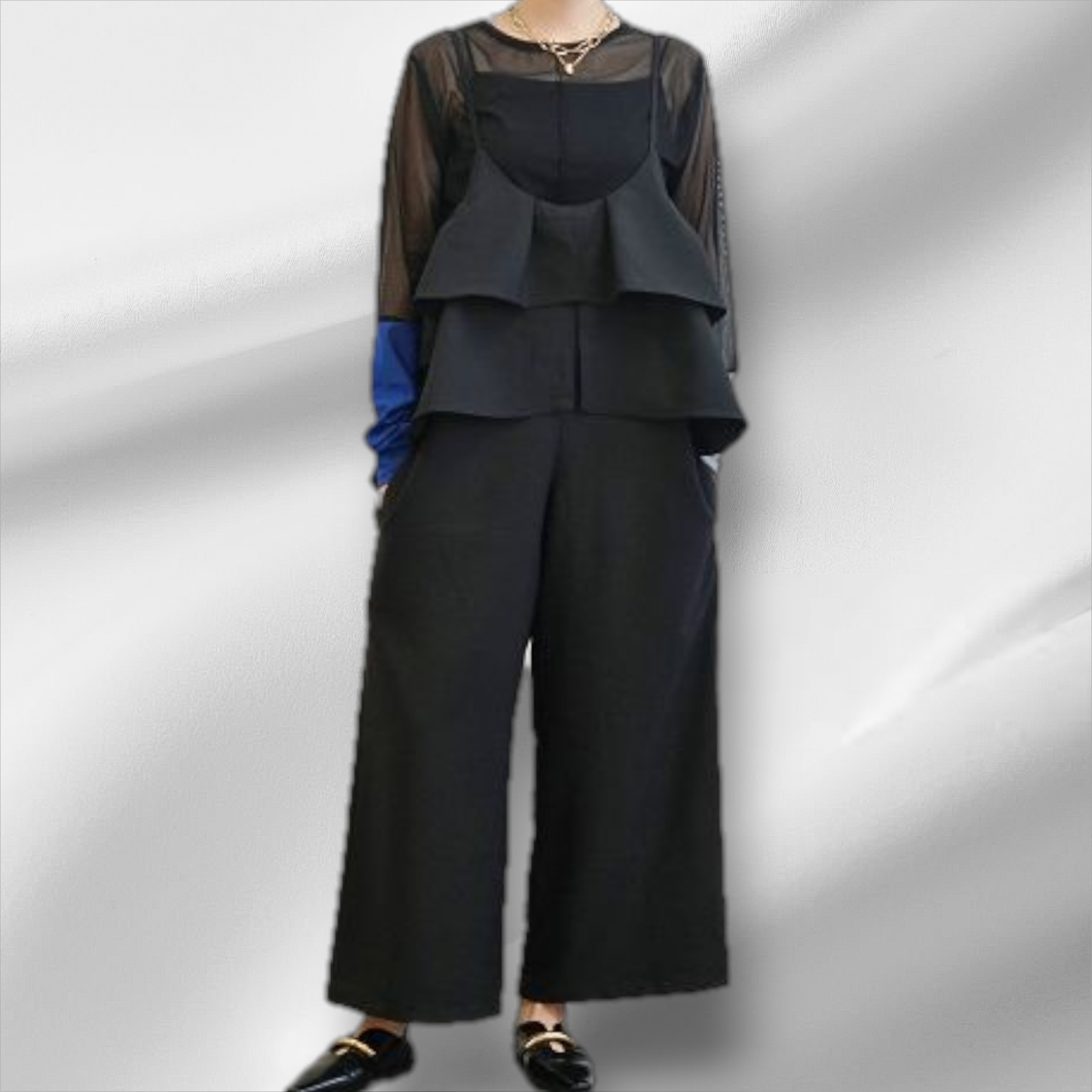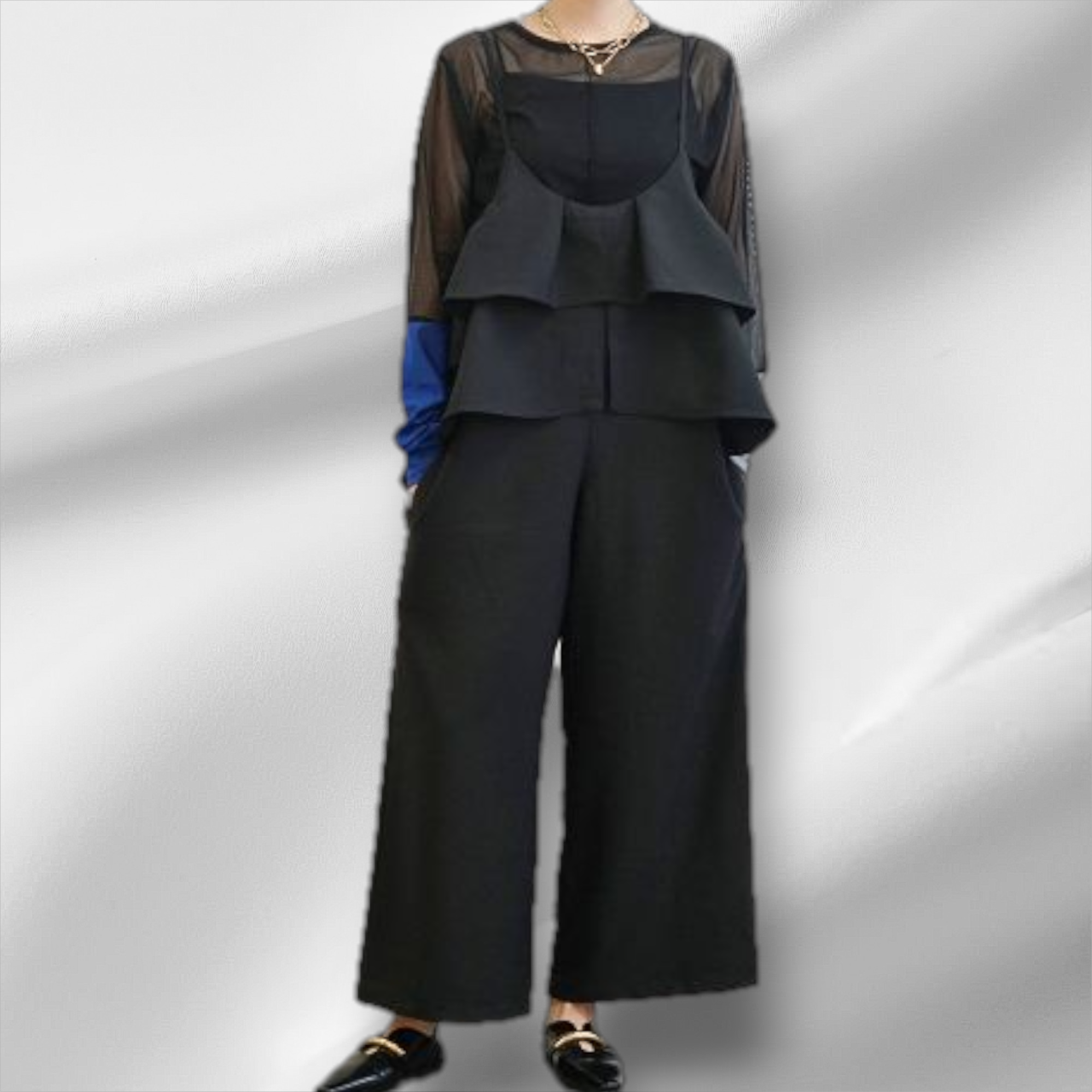 この「フリルサロペット」は、大きめフリルが特徴で、さらっとした落ち感のある素材なので太って見えないです。長さ調節が可能。