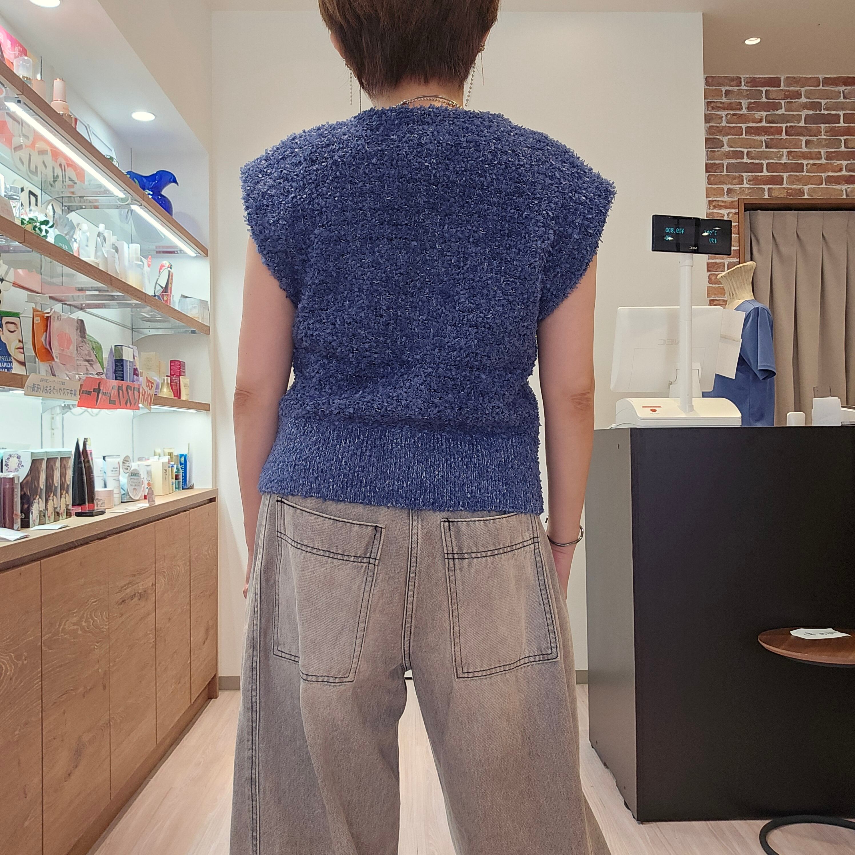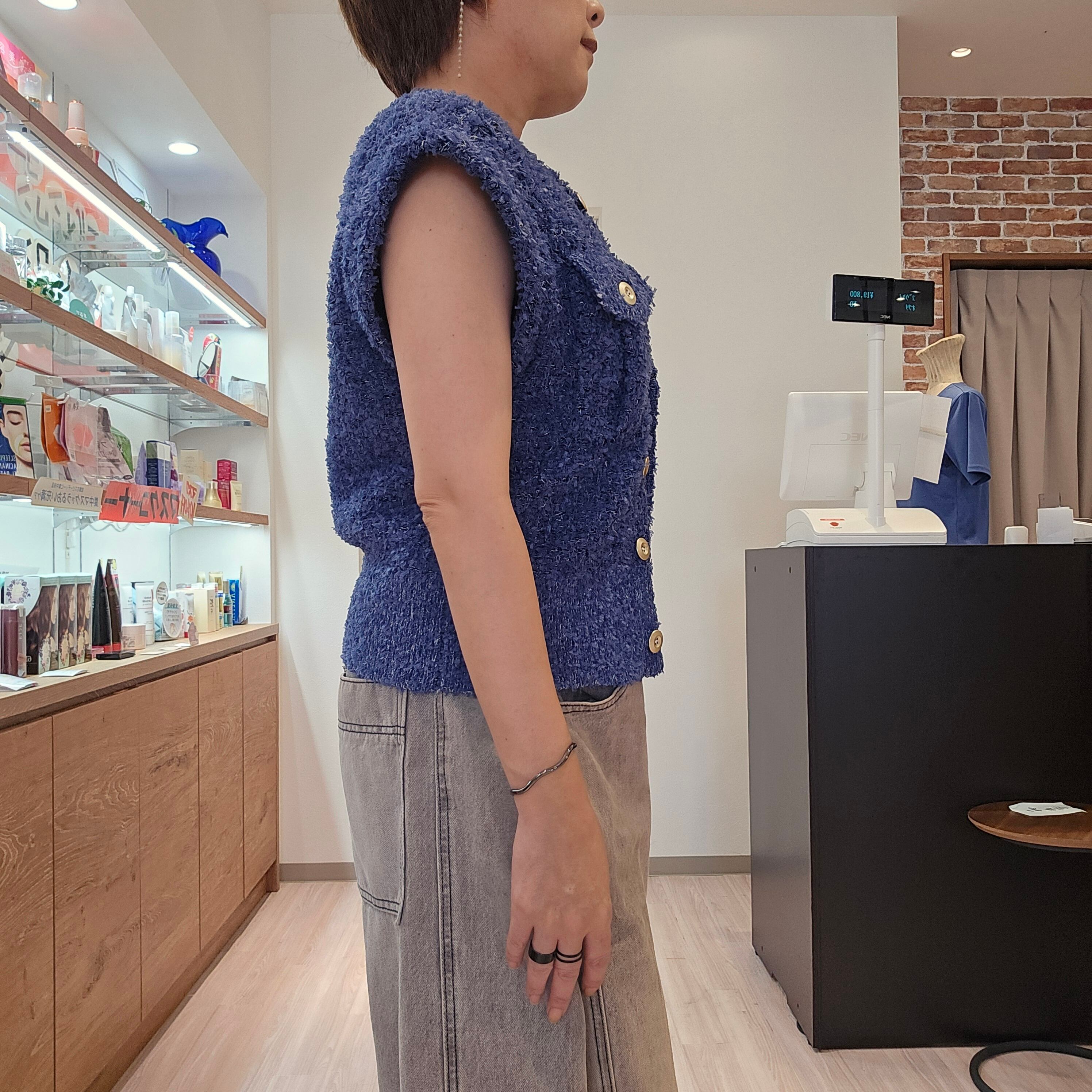 この「ツイーディニットベスト」は、ファンシーヤーン、ラメ糸、ブークレー糸の3種類を巧みに編み込んだ華やかさが魅力のアイテムです!軽やかな編み方で、暑い時期でも繊細な着心地を実現。フレンチスリーブが二の腕をカバーしつつ、すっきりとしたシルエットを演出します。