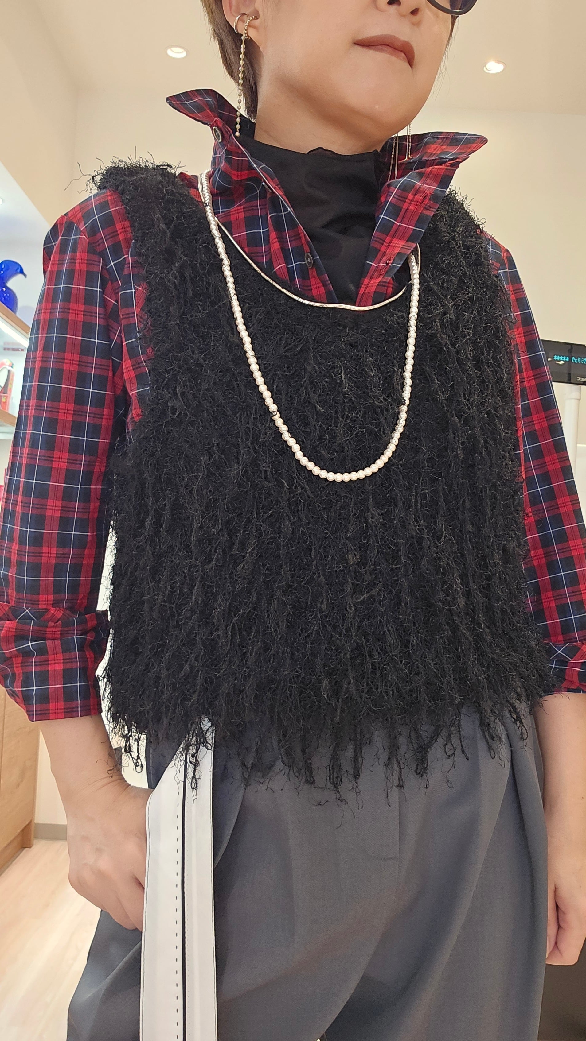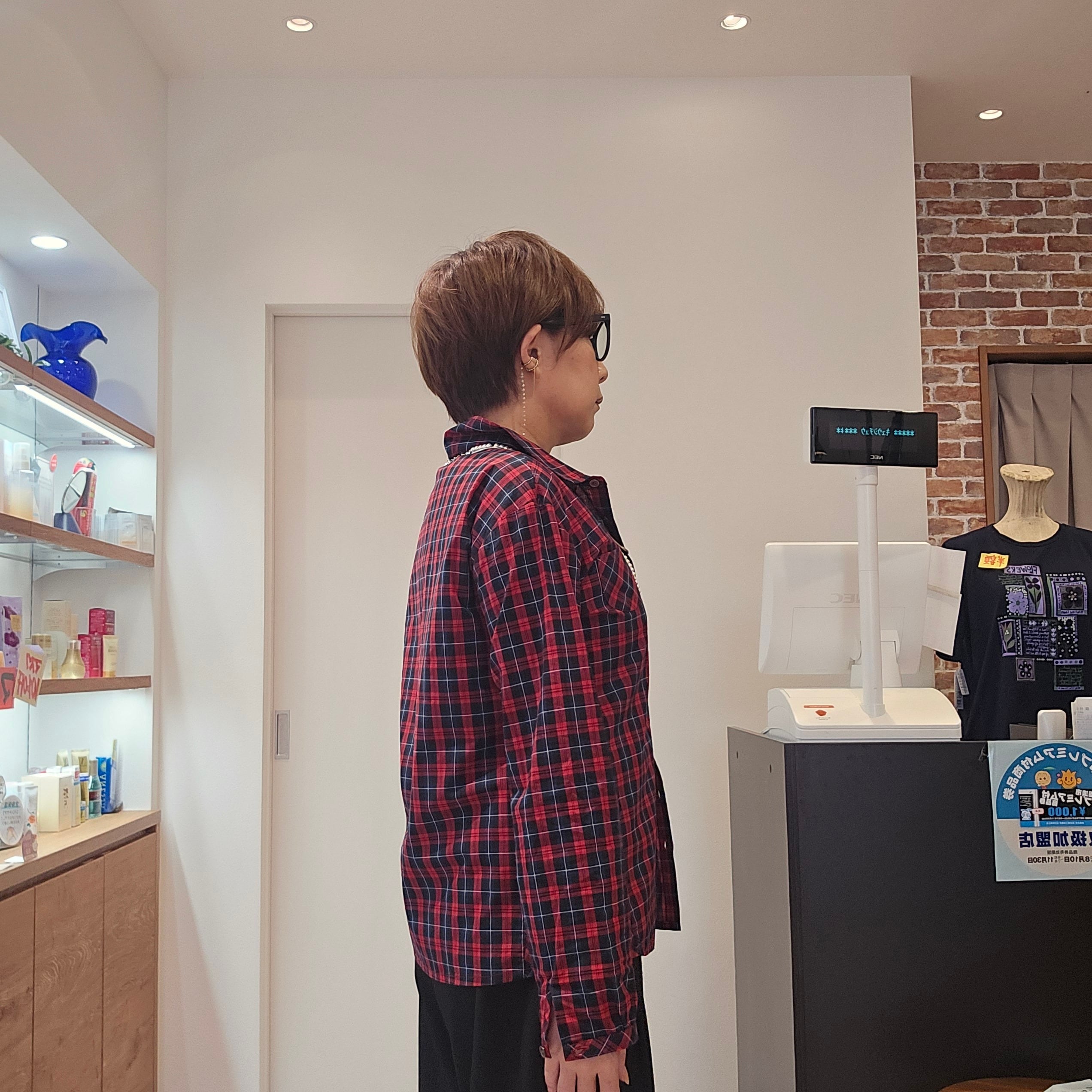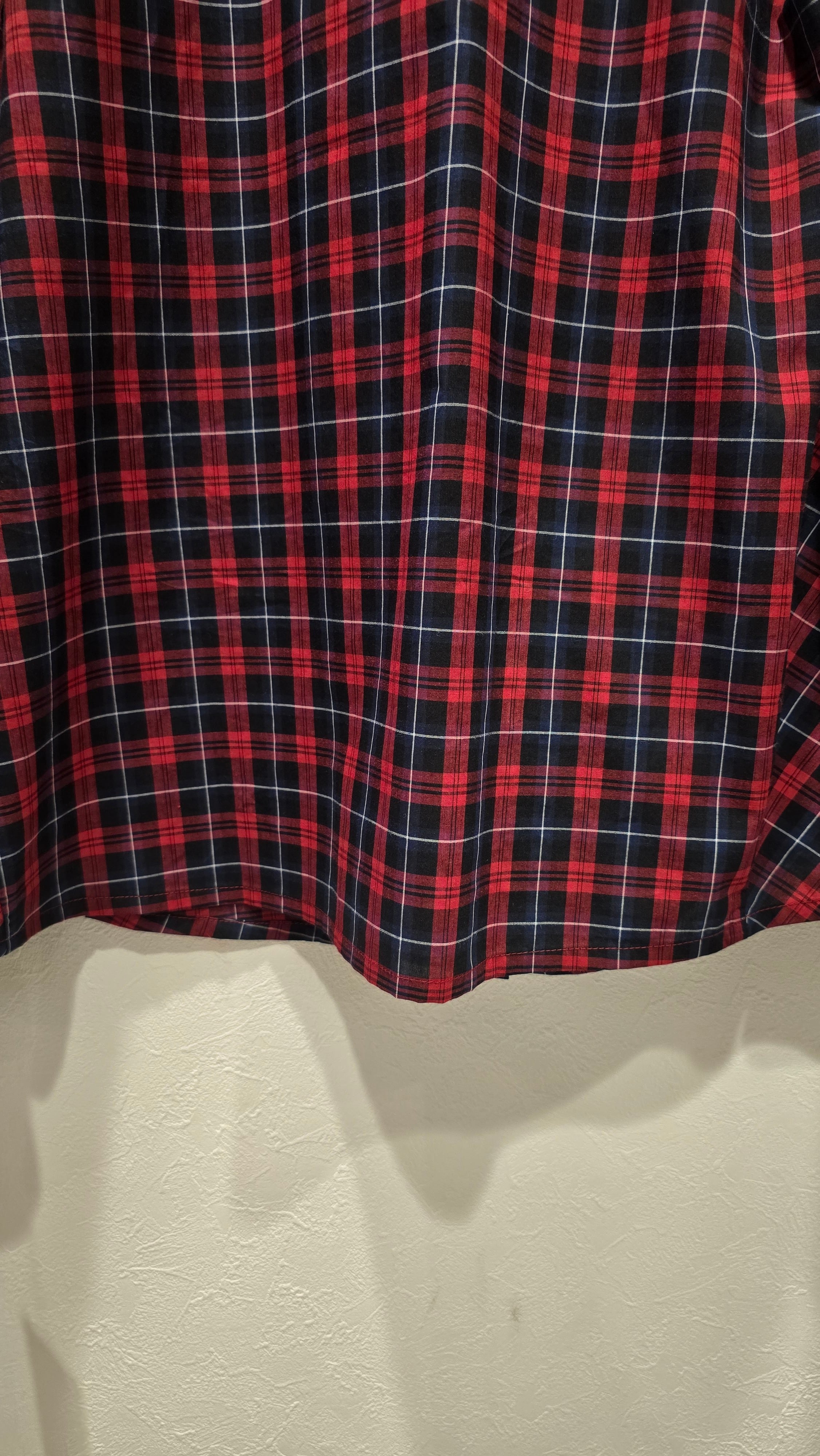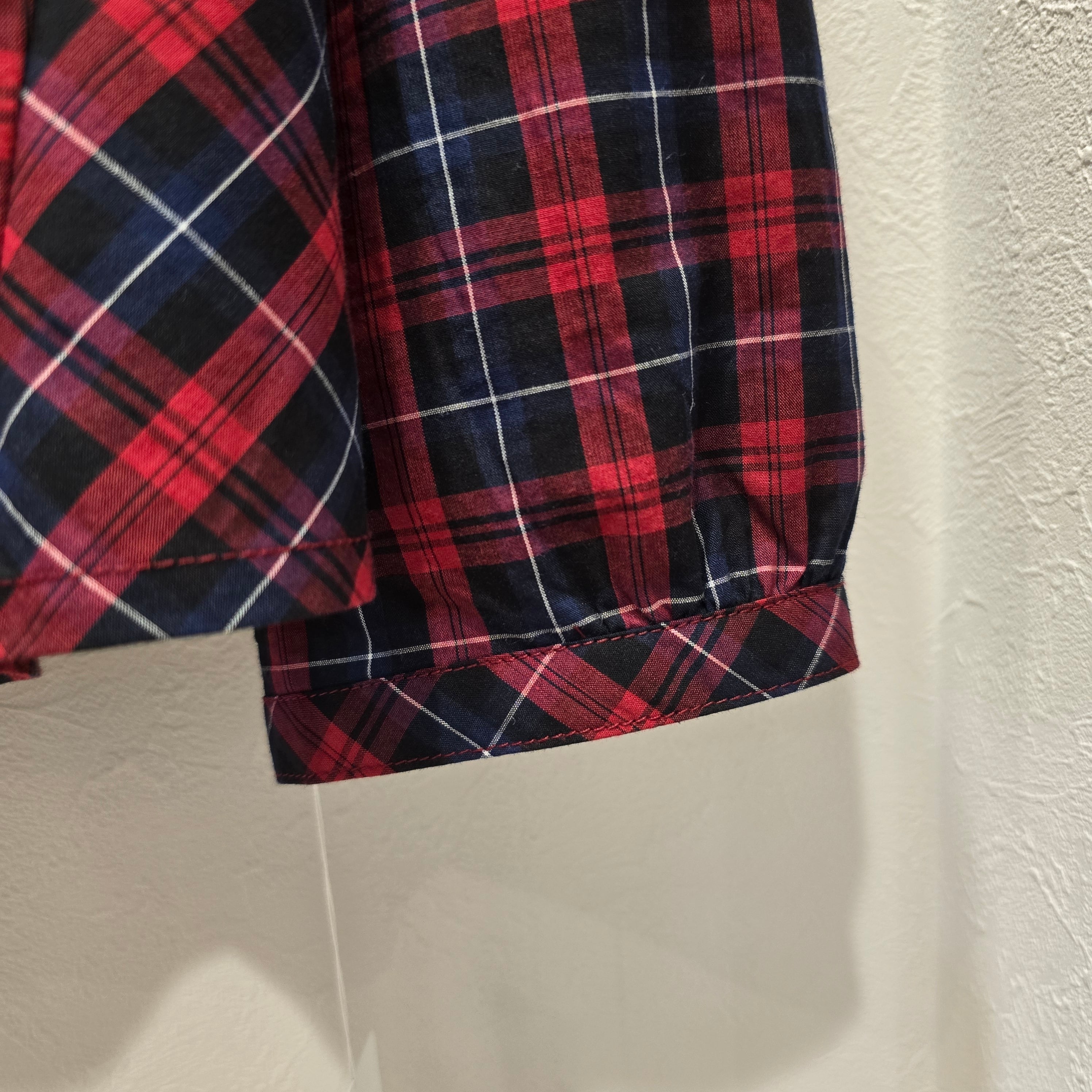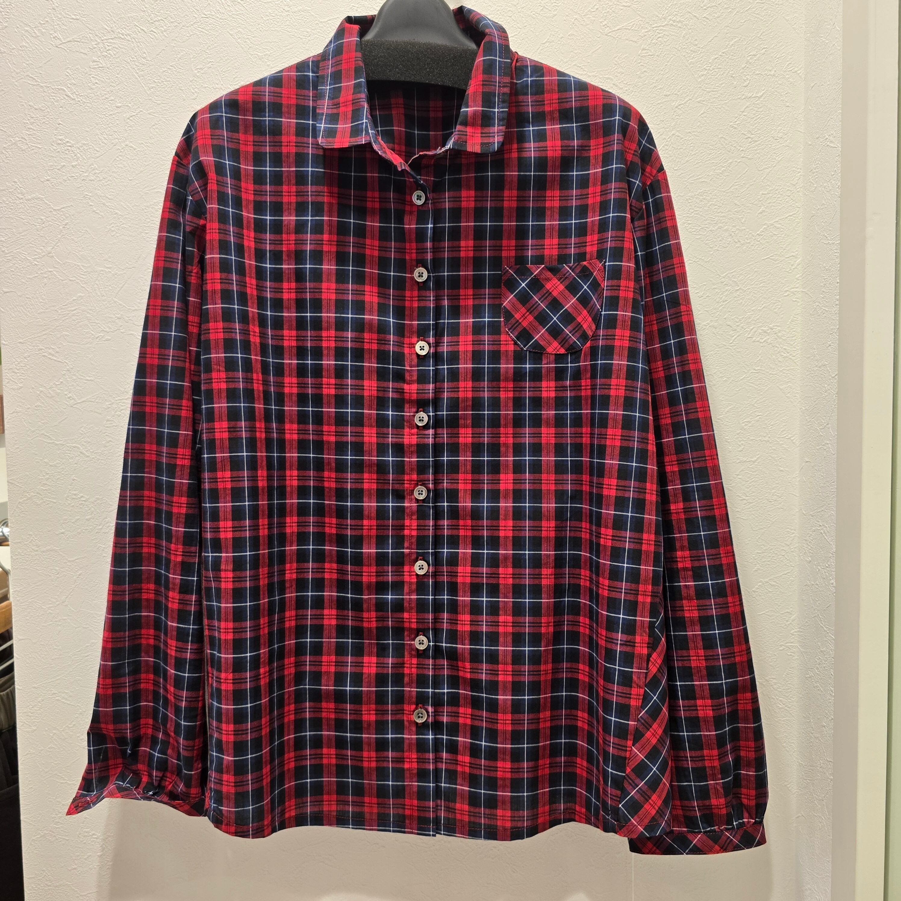 この「チェックシャツ」は、赤と黒、紺、白が混ざり合った美しいチェック柄が魅力のアイテムです!ジャストサイズのシルエットが特徴で、スタイリングの幅を広げてくれます。上からベストを重ねても着こなしやすく、さらに腰に巻いた時もすっきりとした印象を与えることができます。