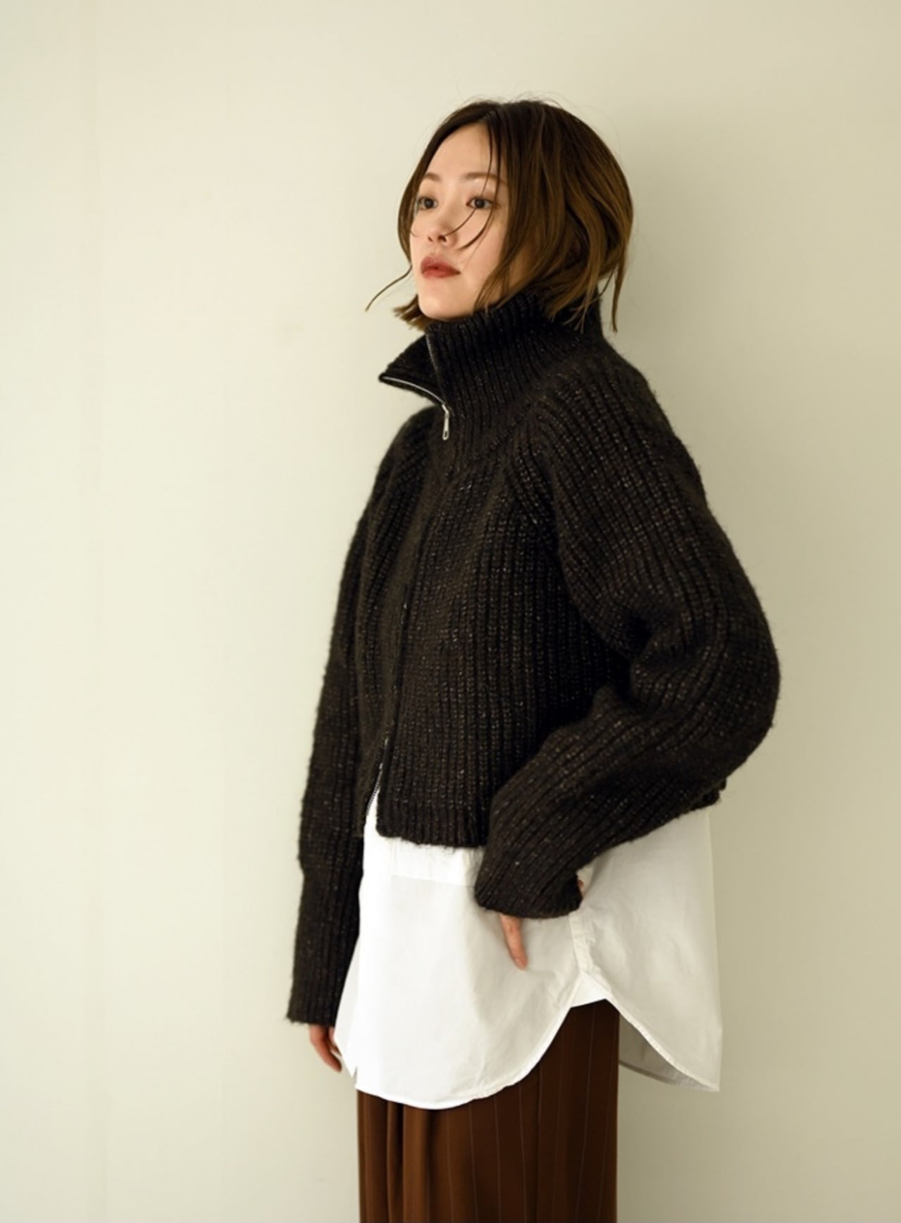 この「【HERENCIA 】ハイネックダブルジップニット」は、トレンド感あふれる短めの丈が特徴の一着です!下にロンTやシャツを重ねてレイヤードスタイルを楽しむことができ、ダブルジップのデザインにより上からも下からも開閉可能な機能性も魅力です。また、厚みのあるニット素材が体温をしっかりと保持し、秋冬シーズンにぴったりです。
