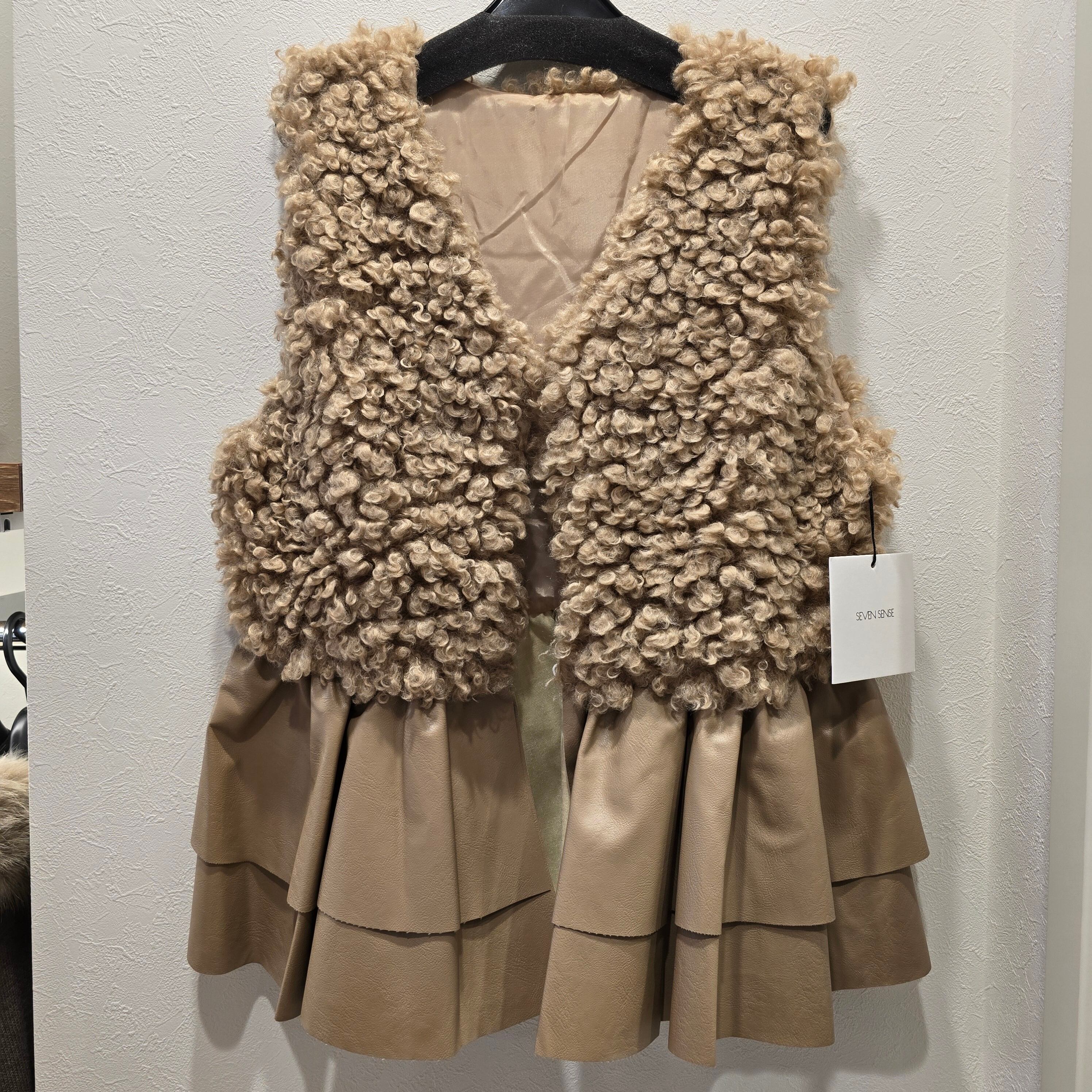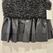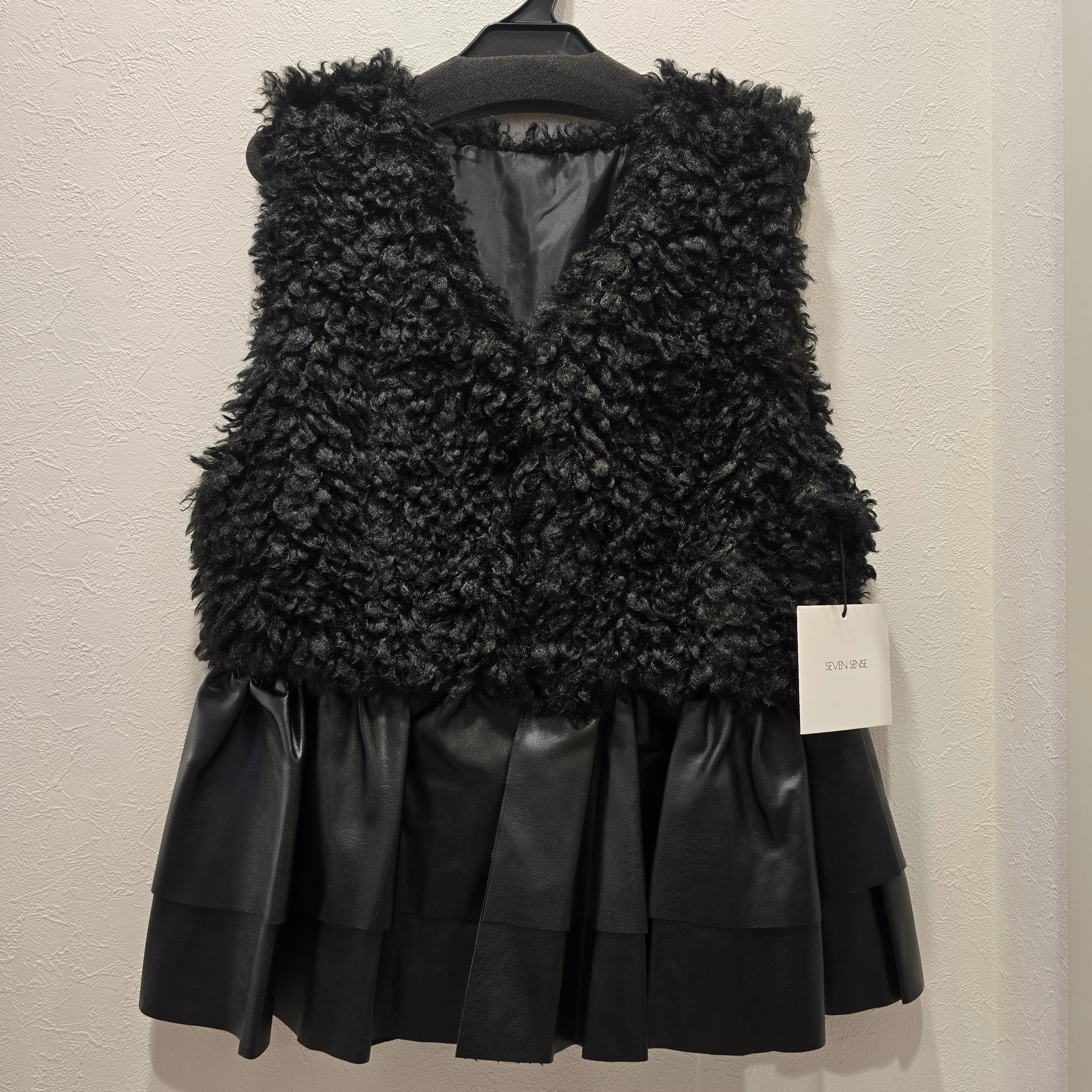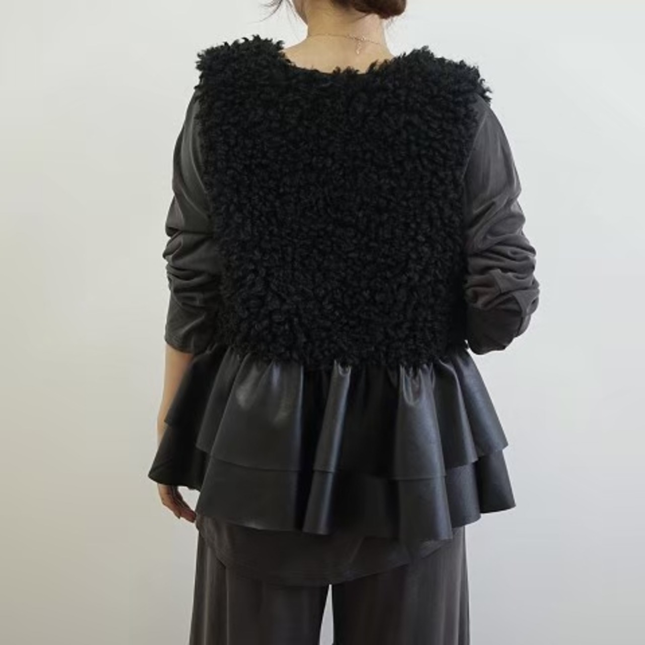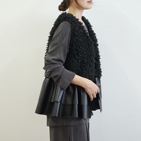 エコファーとレザードッキングの絶妙なバランスが魅力的なアイテムです!裾のフリルレザーがカッコ可愛い印象を与え、スタイリングに華やかさをプラスしてくれます。シンプルながらも個性的なデザインは、デイリーコーデから特別なお出かけまで幅広く活躍します。