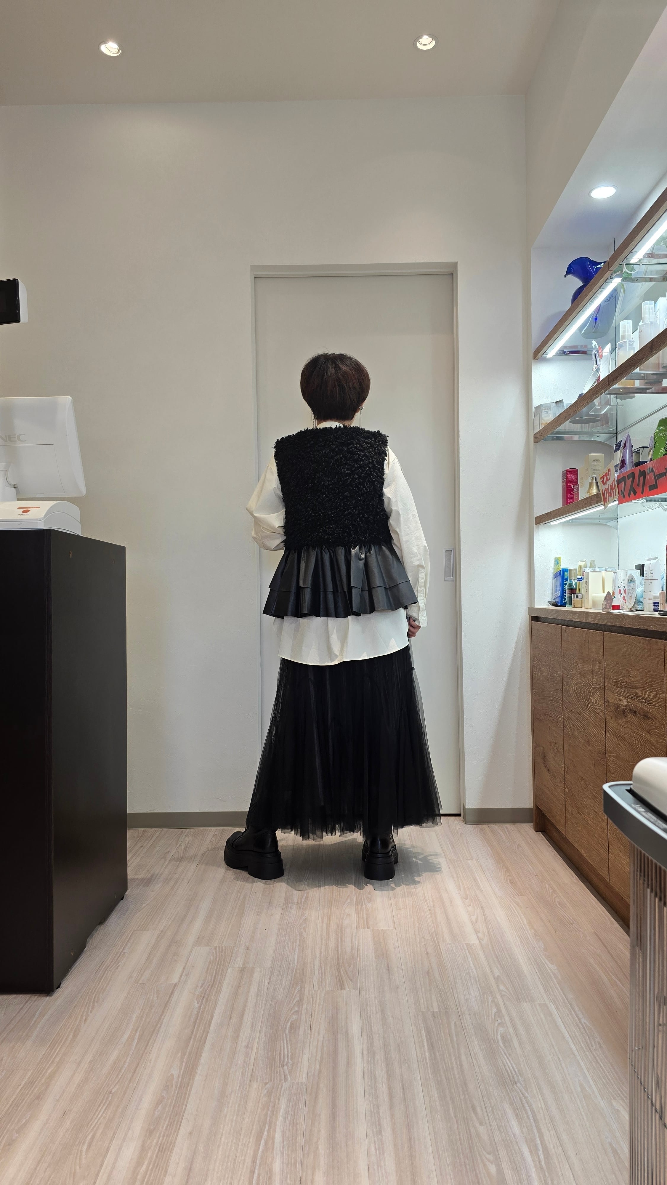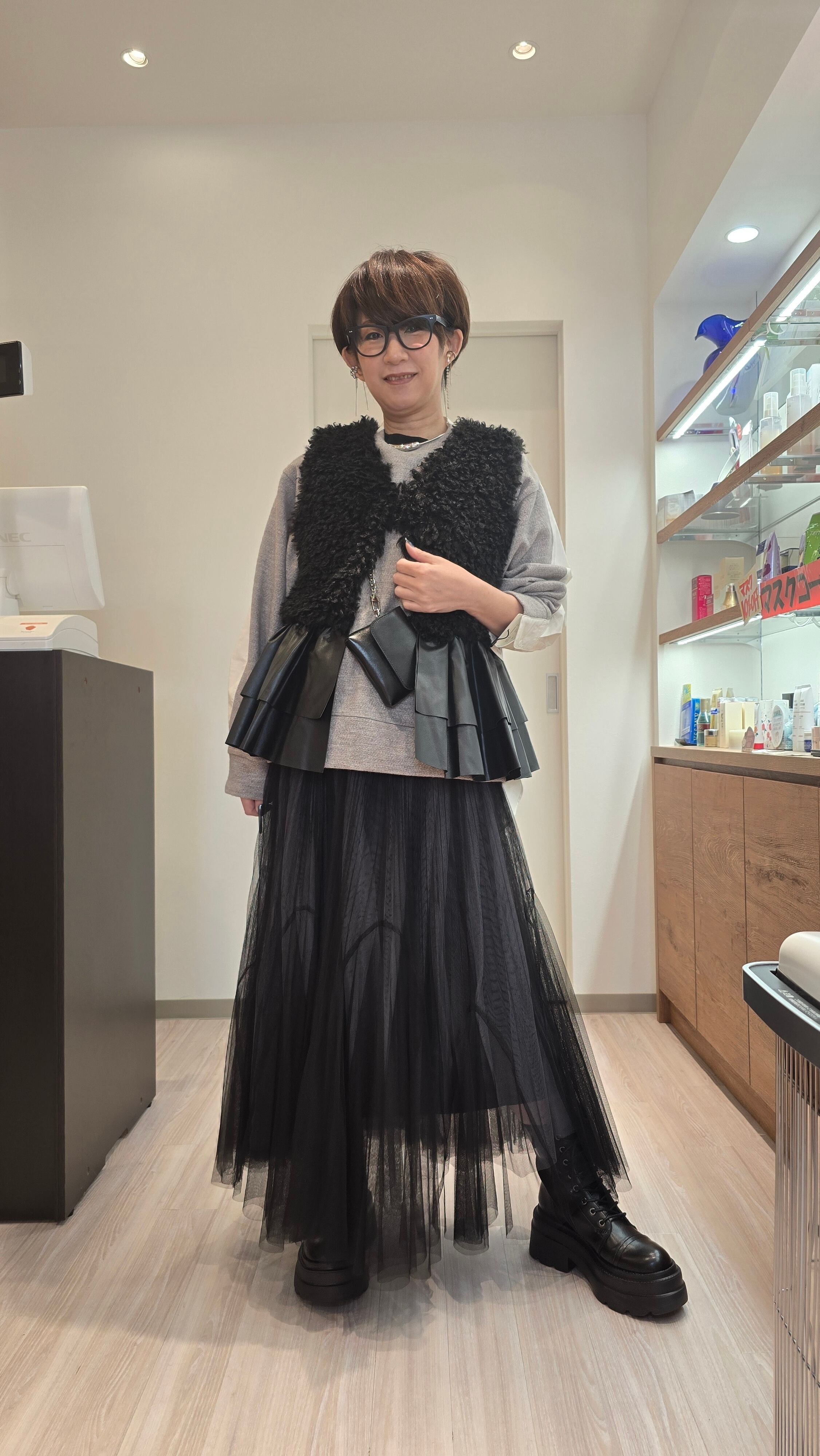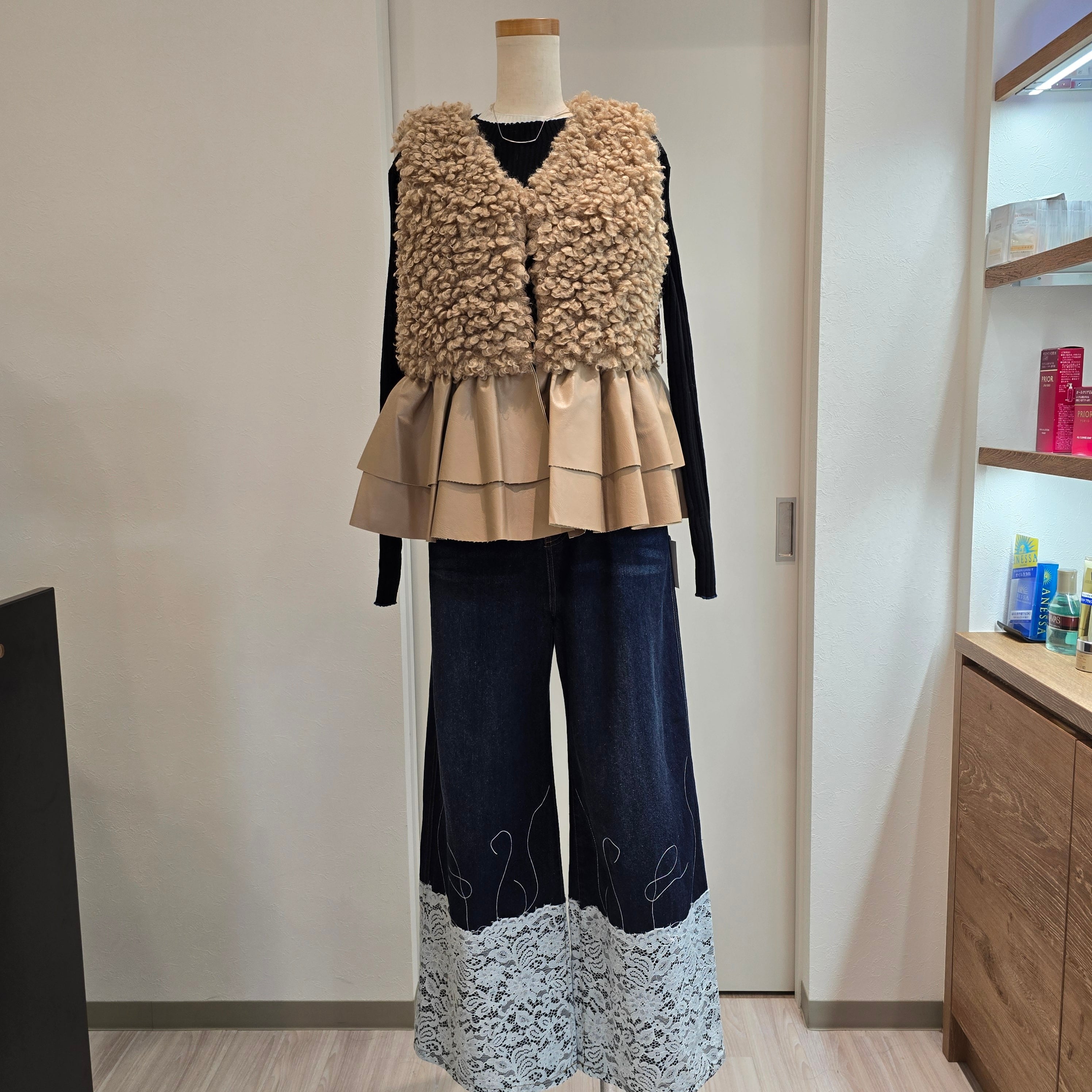 エコファーとレザードッキングの絶妙なバランスが魅力的なアイテムです!裾のフリルレザーがカッコ可愛い印象を与え、スタイリングに華やかさをプラスしてくれます。シンプルながらも個性的なデザインは、デイリーコーデから特別なお出かけまで幅広く活躍します。