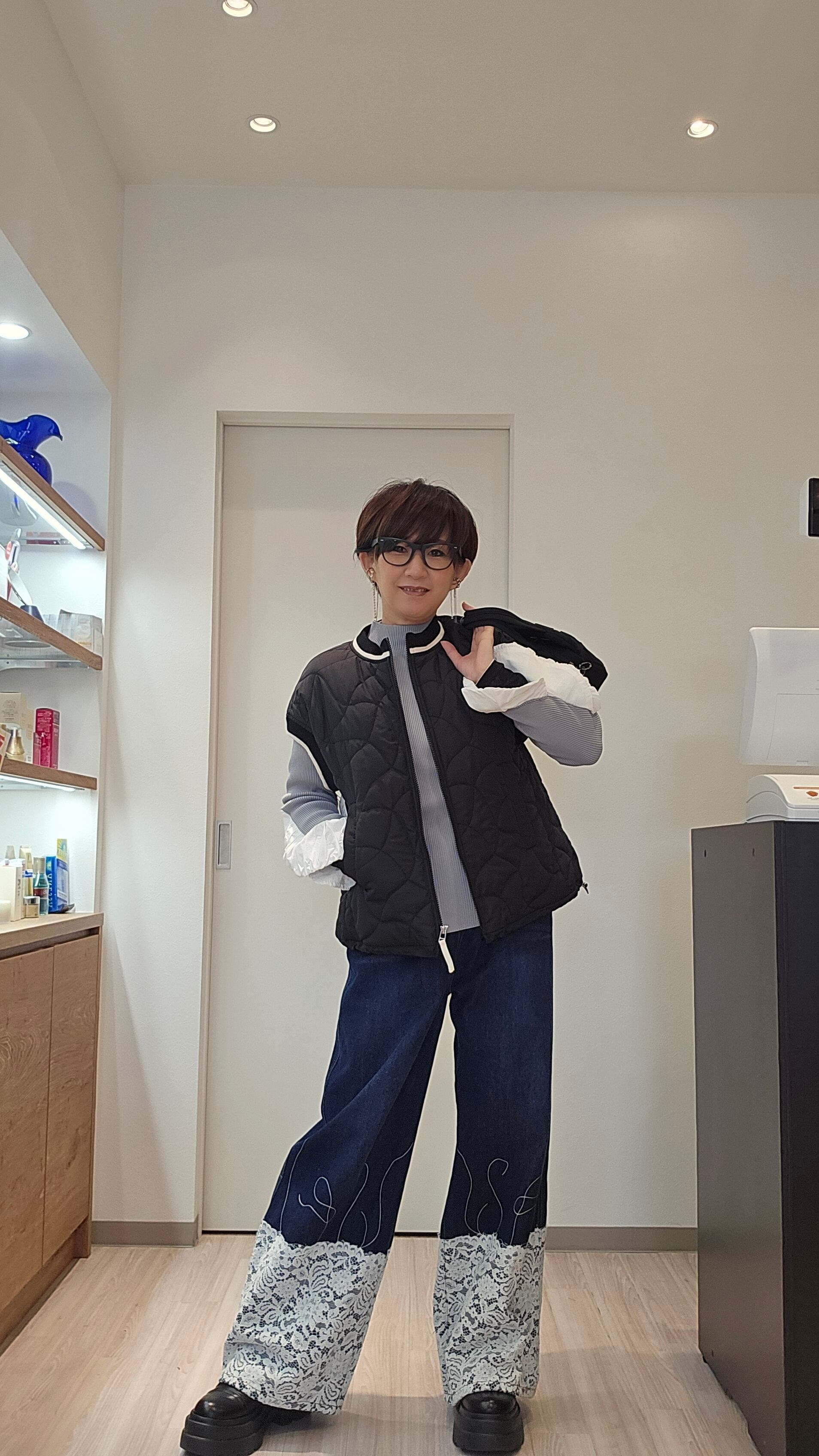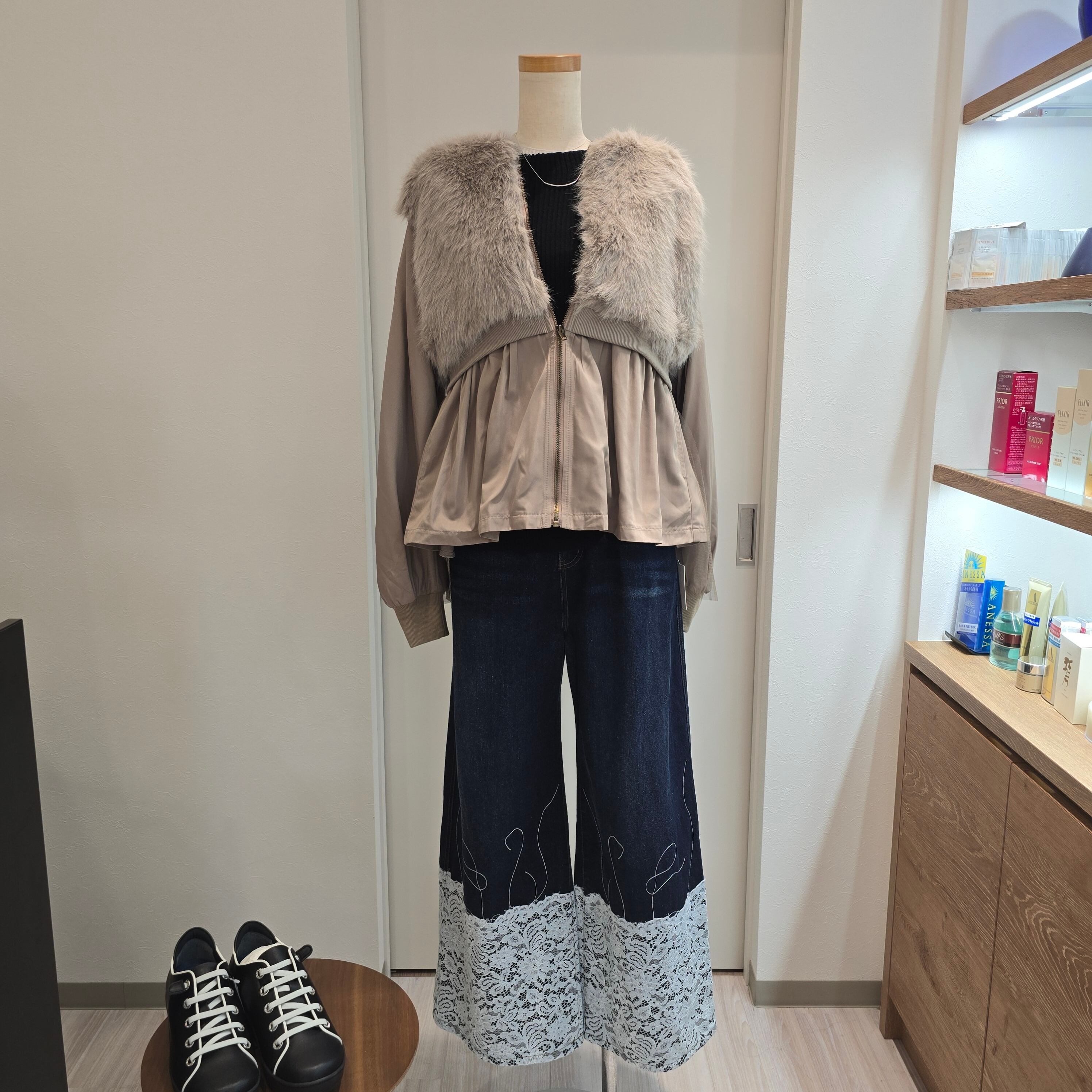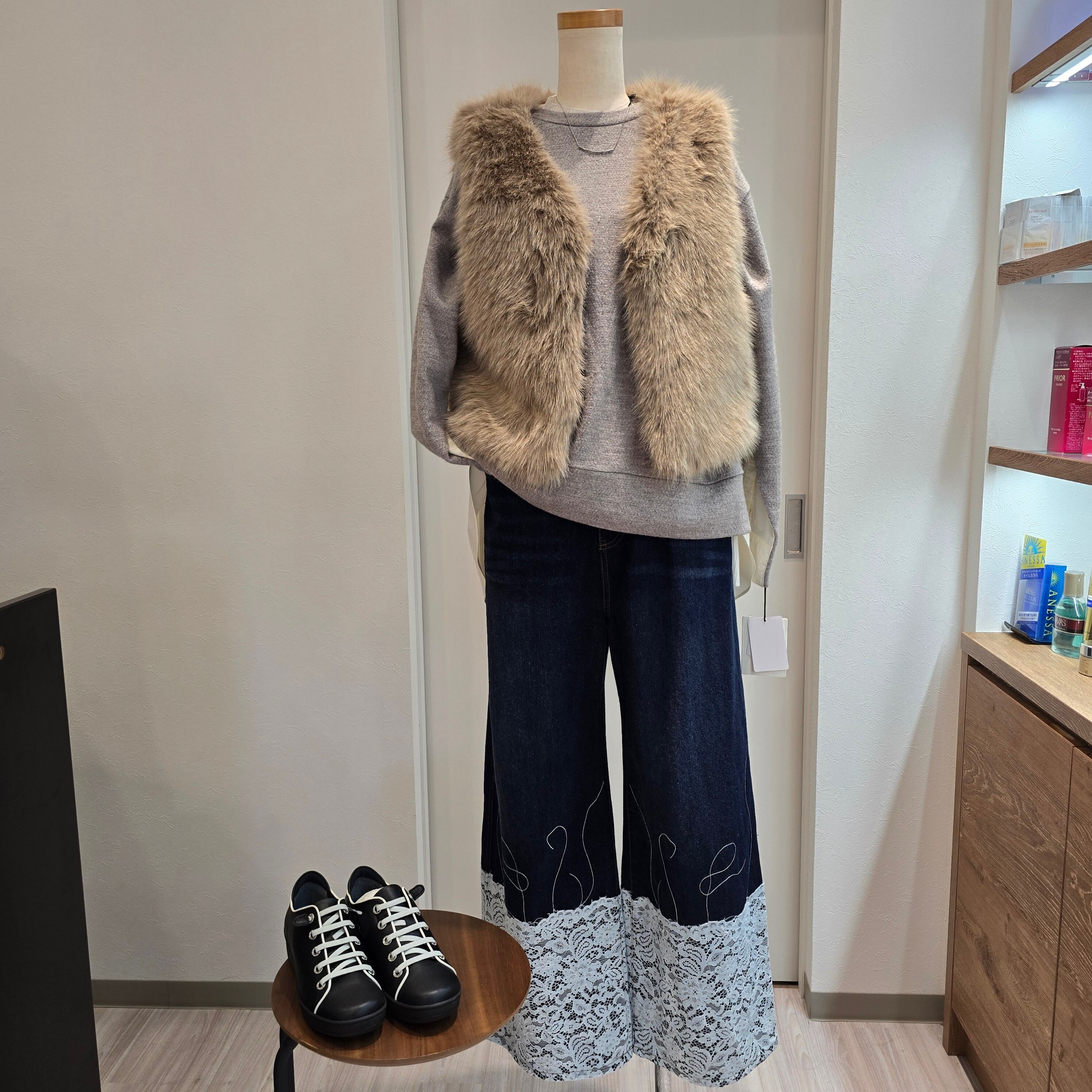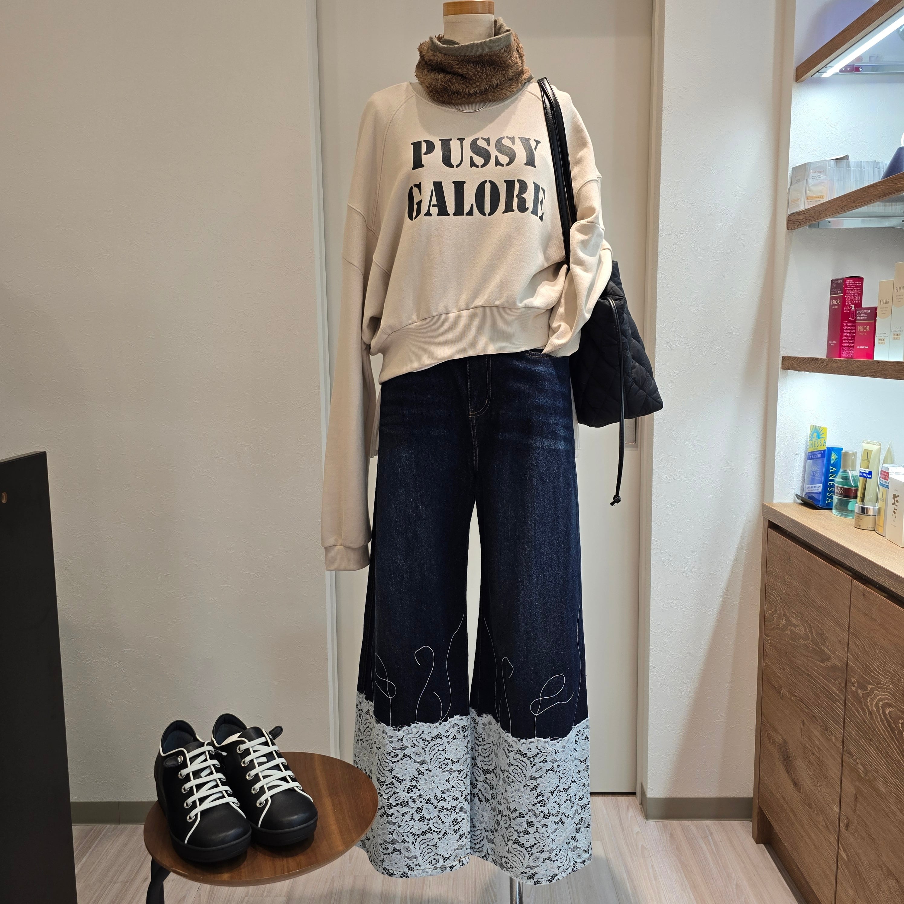 普段使いからお出かけまで幅広いシーンで活躍できる一枚で、シンプルながらも個性的なデザインが魅力です。レースディテールを活かしたコーディネートを楽しんでみてはいかがでしょうか!