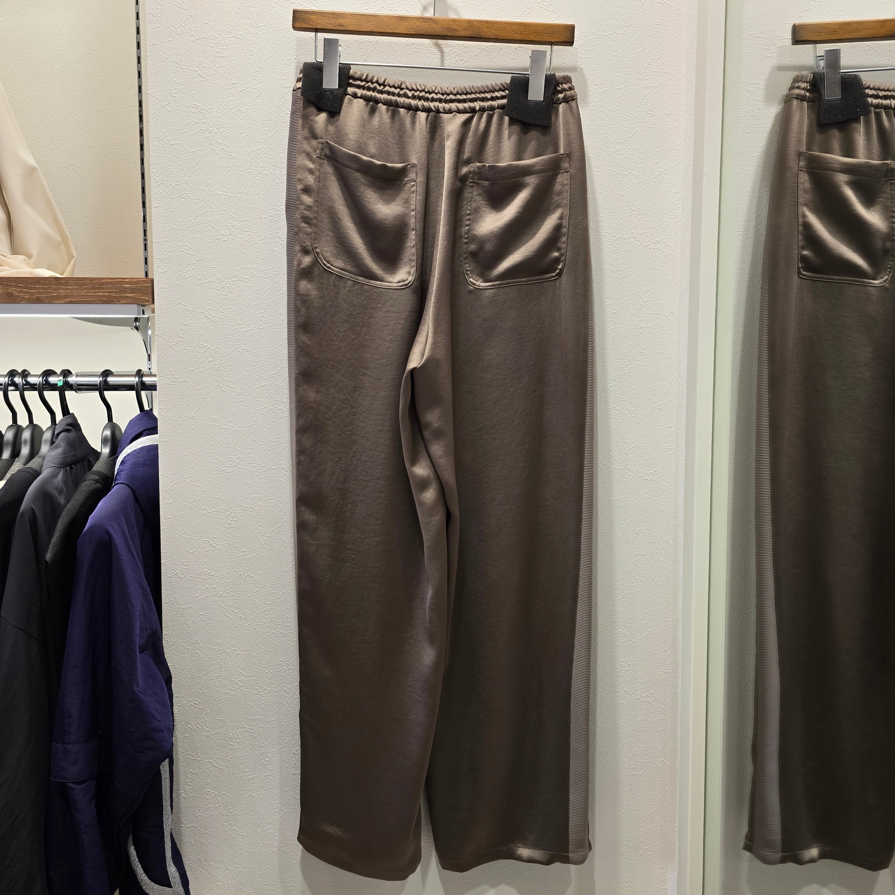 この『リツコシラハマ』サイドラインパンツは、光沢のある素材が特徴で、落ち着いた大人の雰囲気を漂わせる魅力的なアイテムです!ウエストはゴム仕様で、快適さを追求したデザインとなっており、リラックスした着心地を実現しています。