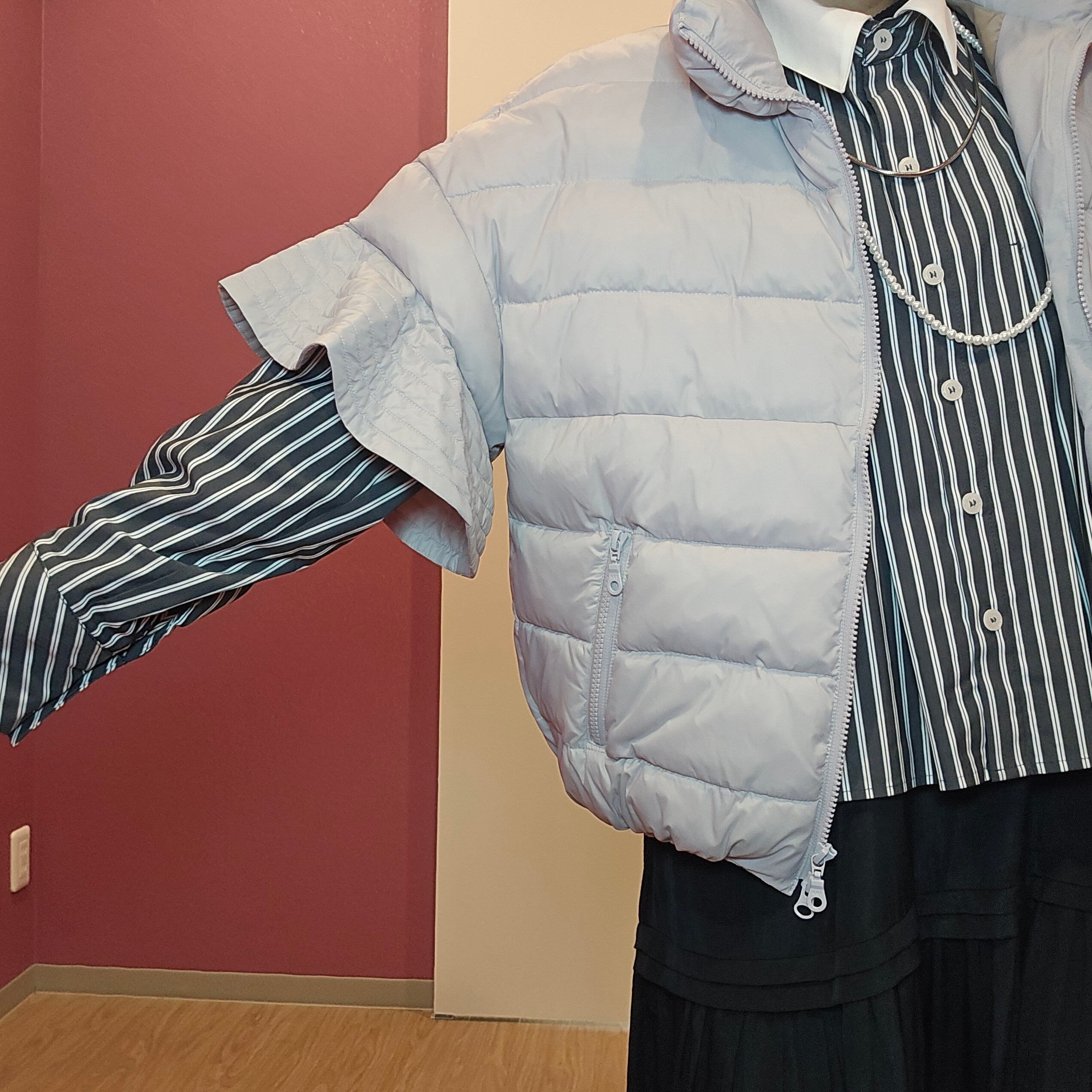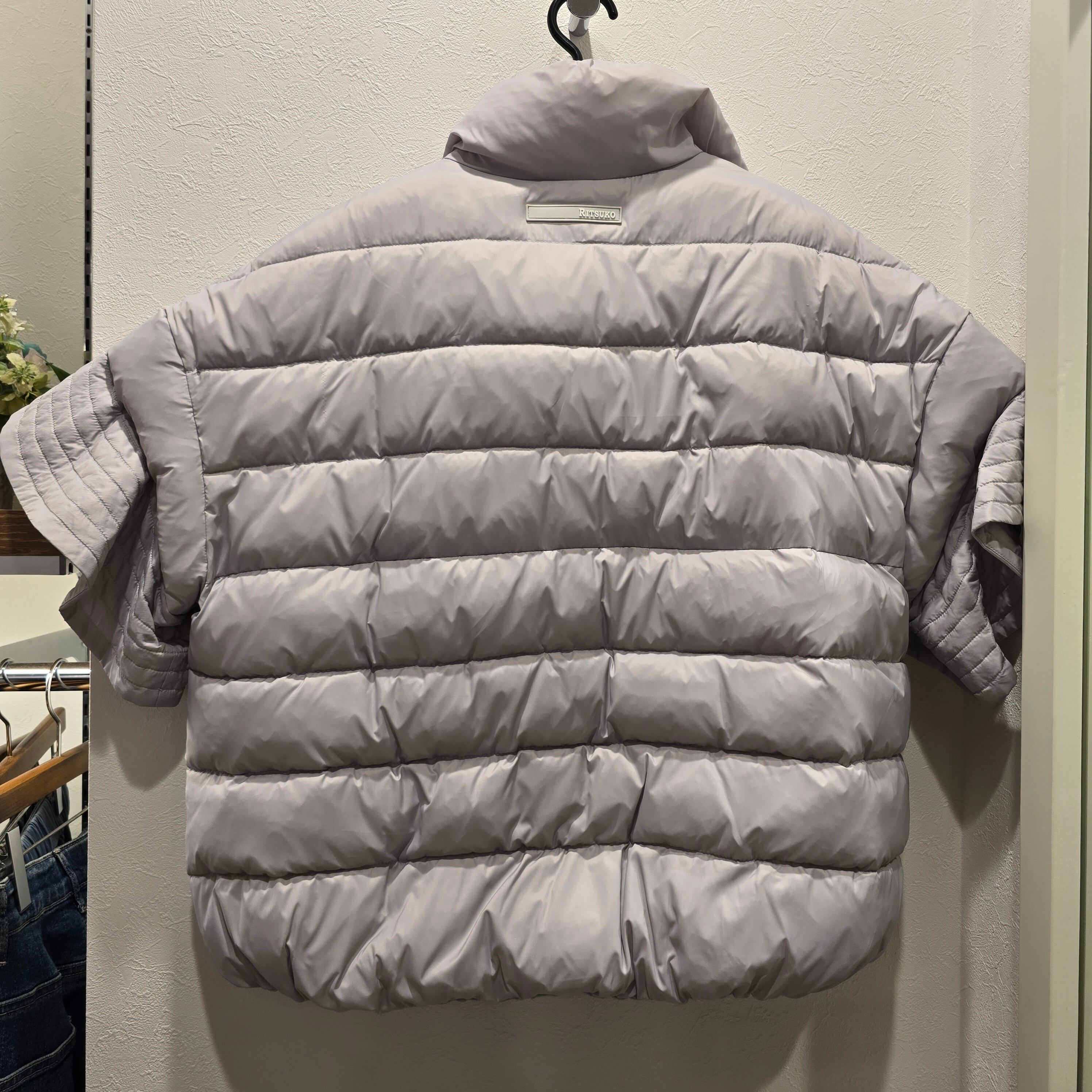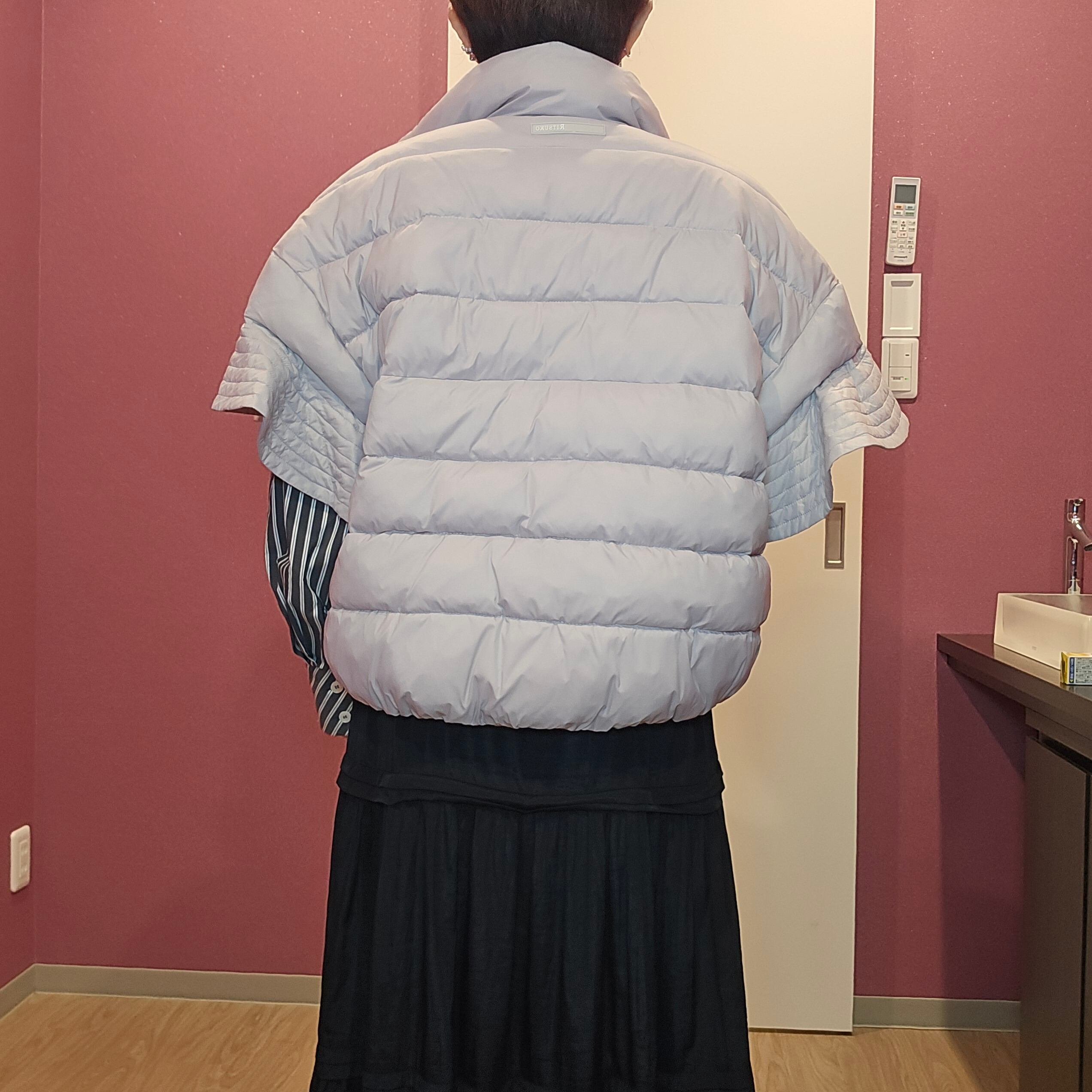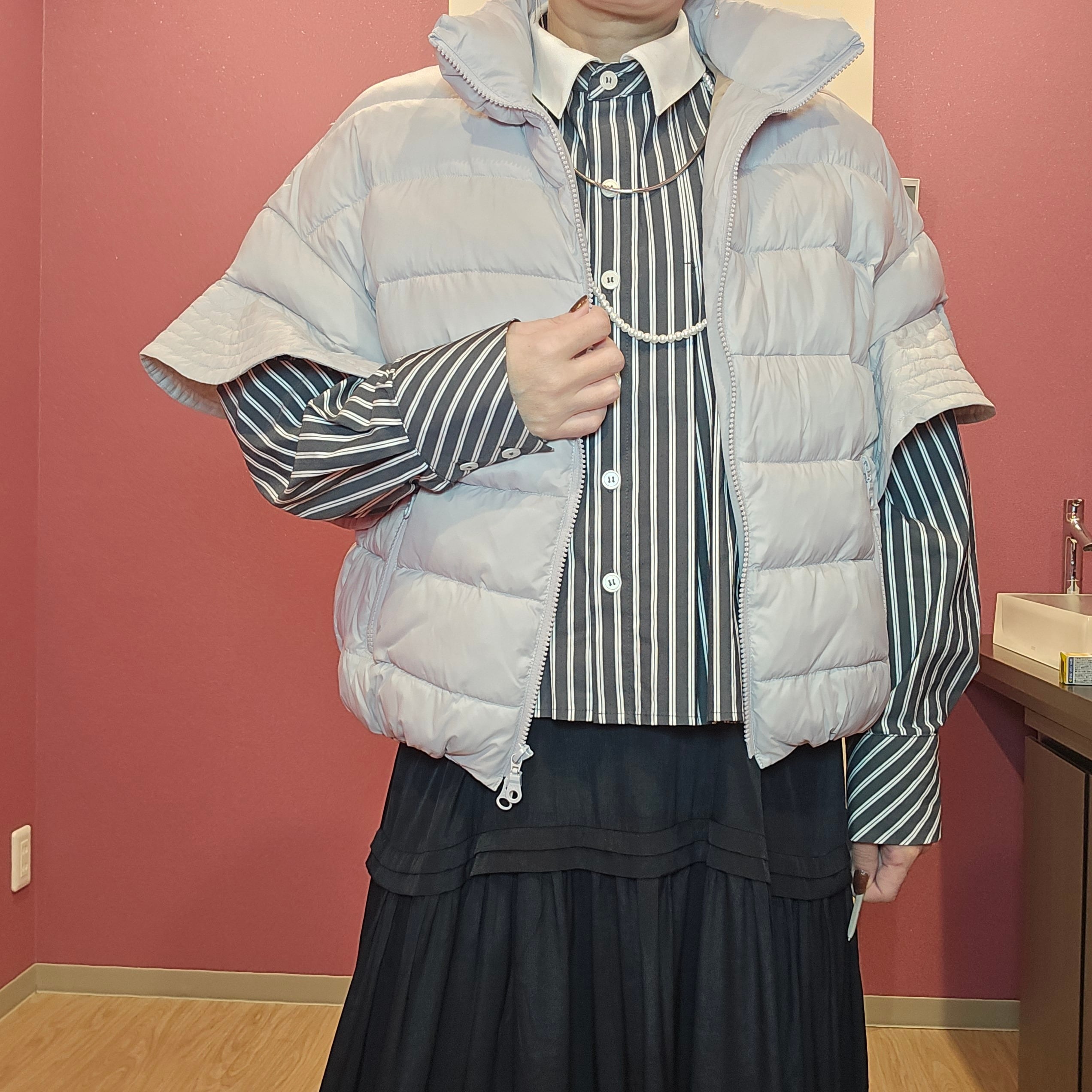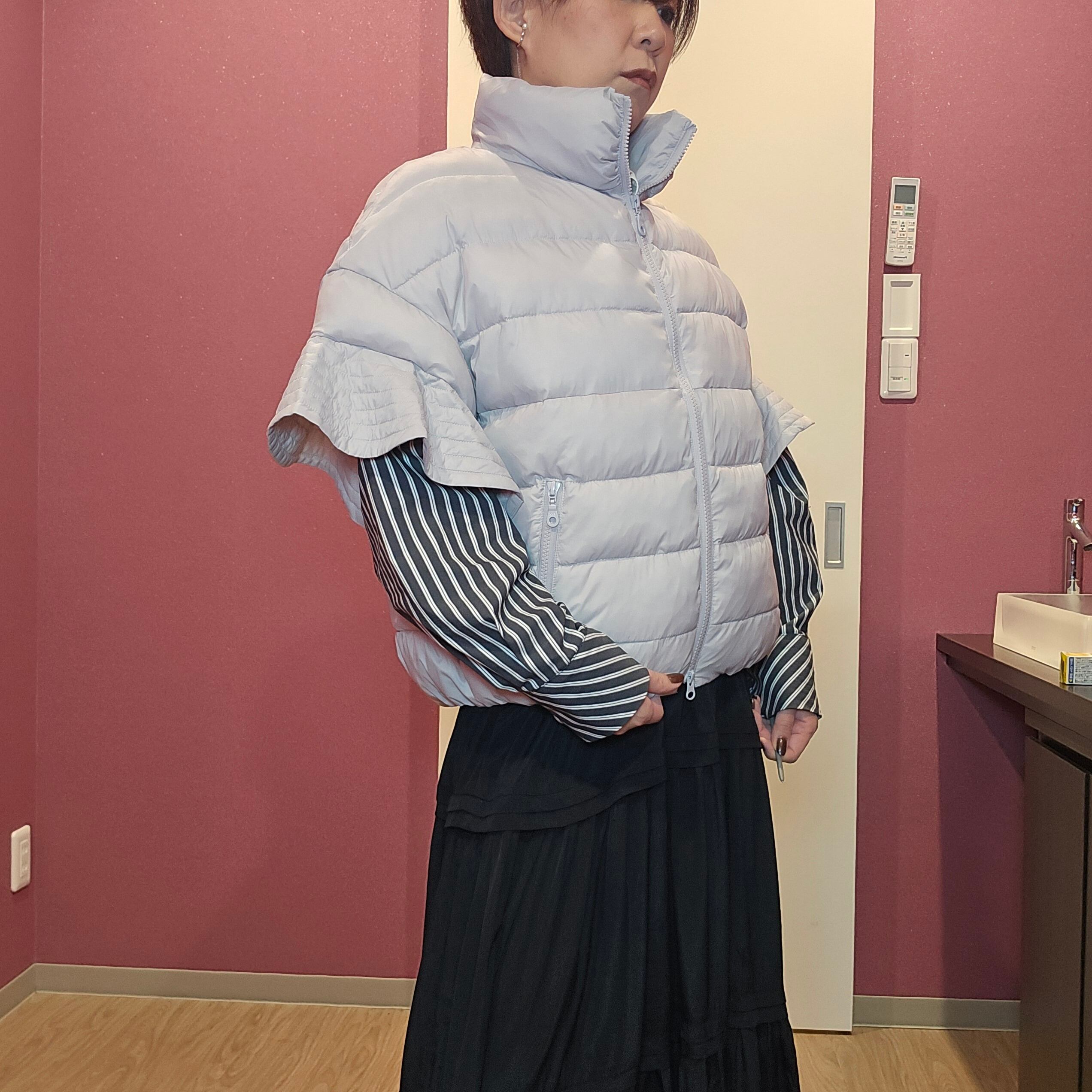 軽くて暖かいダウンベストです。袖のフリルがなかなかないデザインで、お洒落です。薄いグレーなので、どんな色とも相性がいいので、袖から違うカラーのインナーを出して、楽しんで下さい。