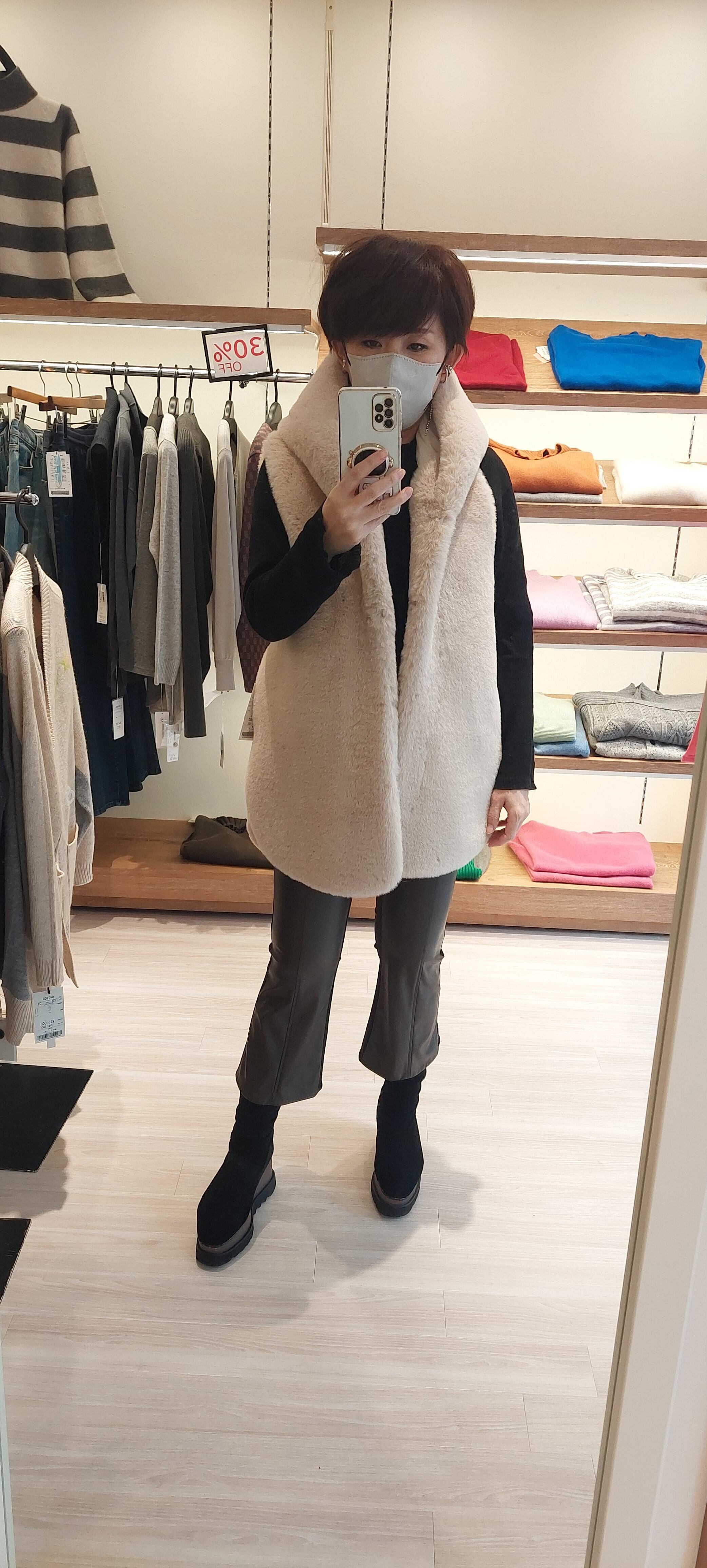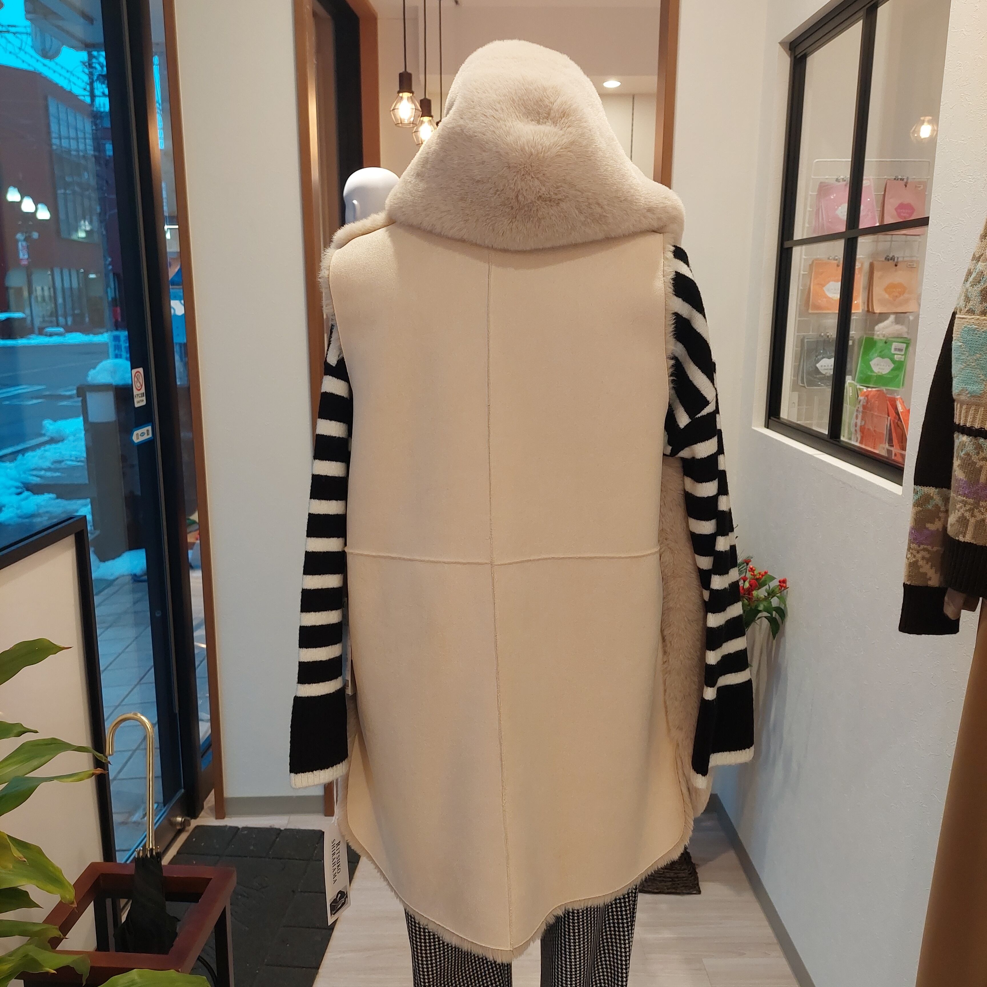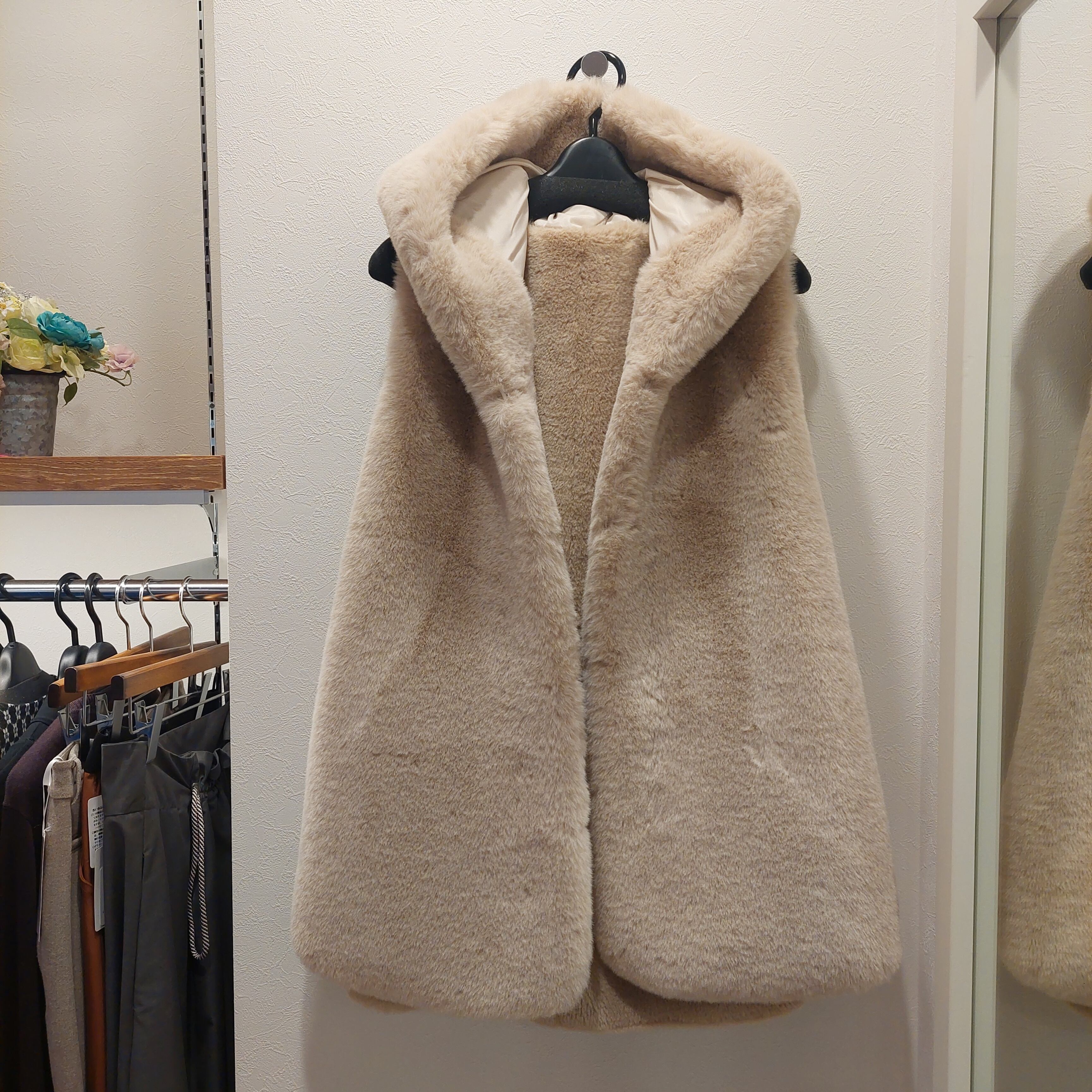 新登場!スタイリッシュな【ファーベスト】です!後ろがスエード素材で作られた贅沢なファーベストは、暖かさとデザイン性を兼ね備えています。帽子つきのデザインが特徴で、寒い日でもおしゃれを楽しむことができるアイテムです。