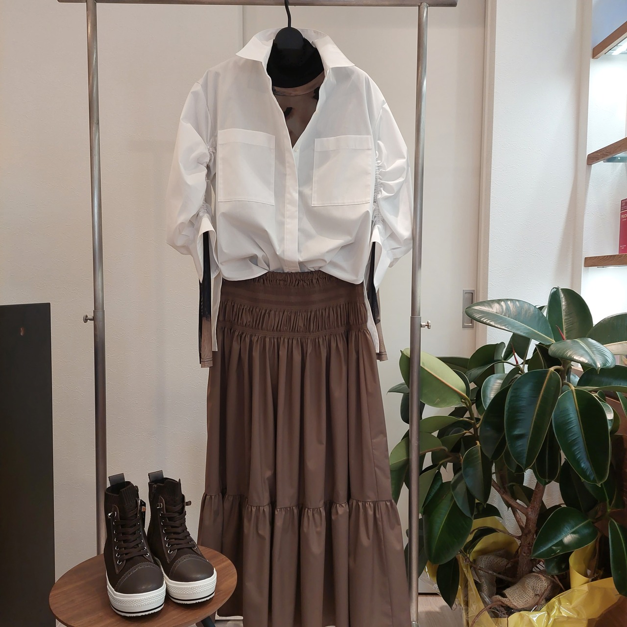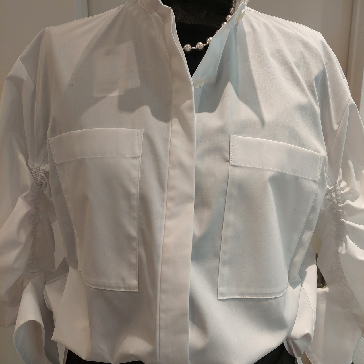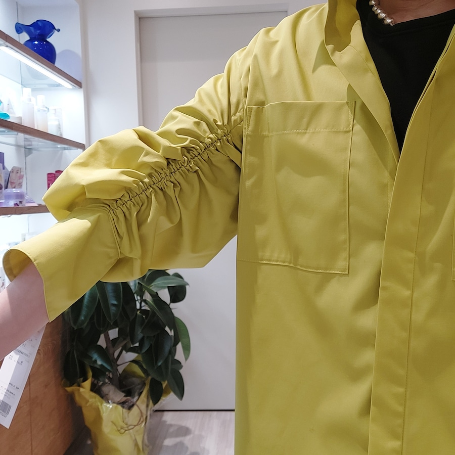 腕の内側に、ゴム入りのシャーリングがあり、自然に腕まくりしたようなデザインに